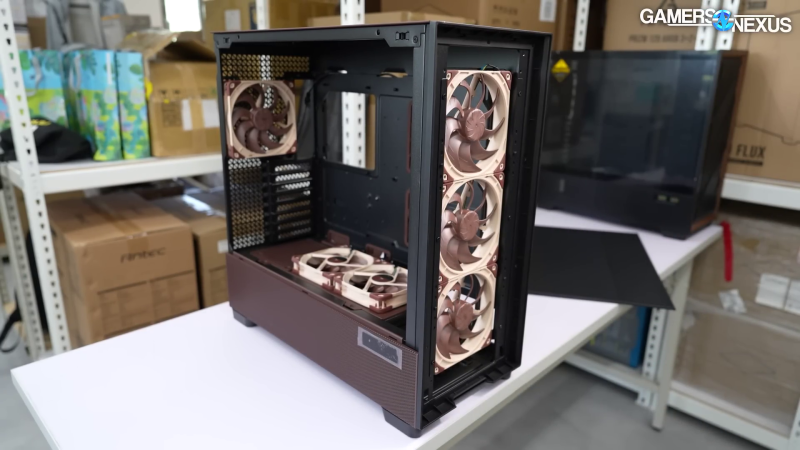 The case has a lot of aluminum in it. The model at Computex also came with Noctua fans, but they’re not brown. Specifically, the case featured Noctua’s black NF-A20s, which are fans we’ve reviewed and benchmarked. They did pretty well in our testing.