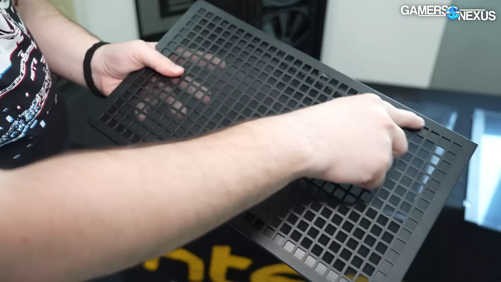 Looking at the top panel, it uses massive holes in its design coupled with a dust filter. In some ways, this is traditional. The upside is that the actual panel itself isn’t doing a whole lot other than just providing the structure, which means it’s not really getting in the way of airflow because of how huge the holes are. It’s really going to come down to the dust filter for how much air can get through. If you’re going to use the top panel for exhaust, we would recommend pulling the dust filter off because it’s not stopping a whole lot of dust.