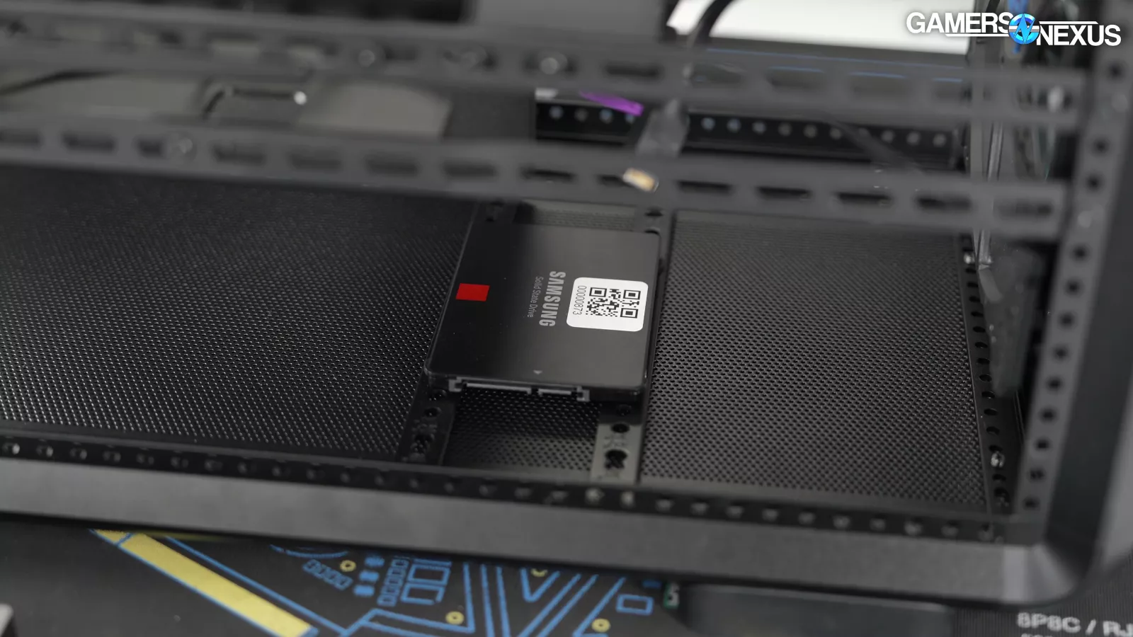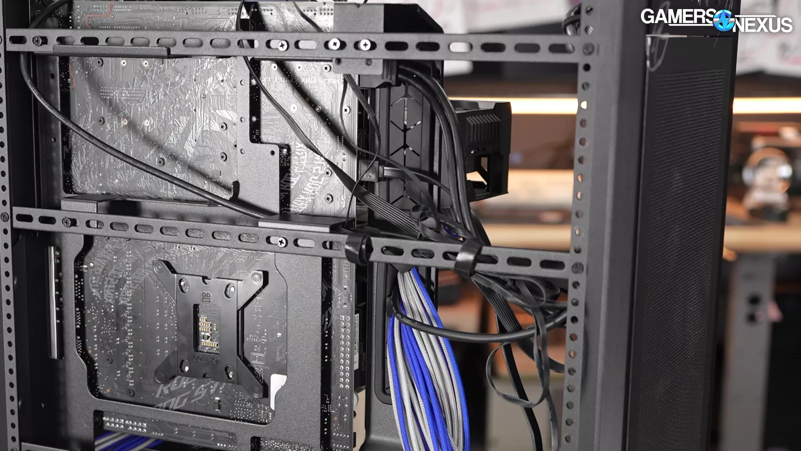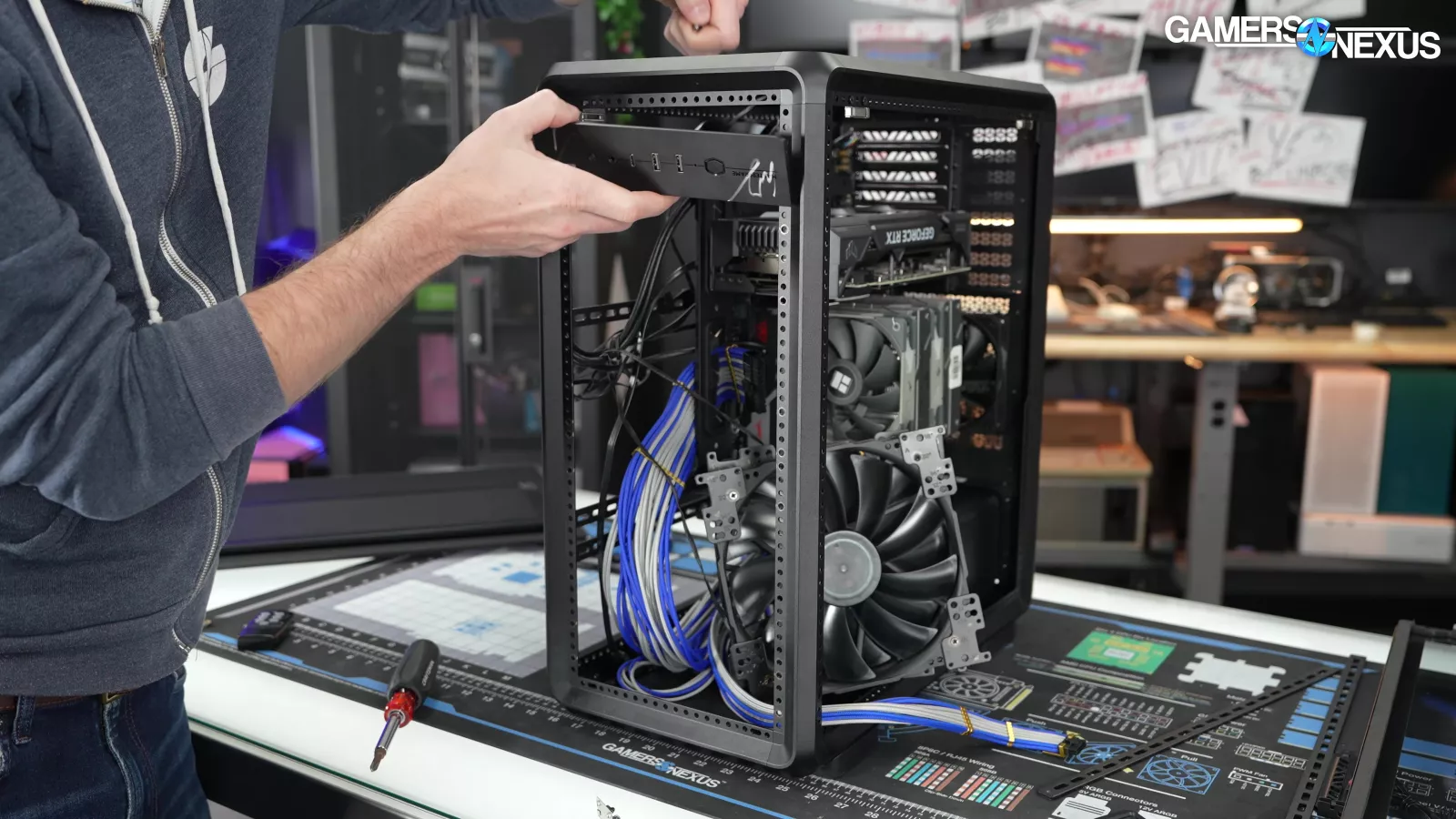 In all configurations, we kept the PSU fan oriented to pull air from the exterior of the case (facing away from the PSU shroud). The GPU support was not installed for any thermal tests.