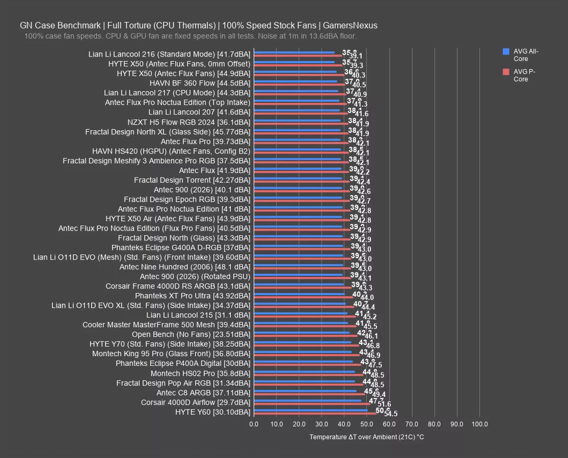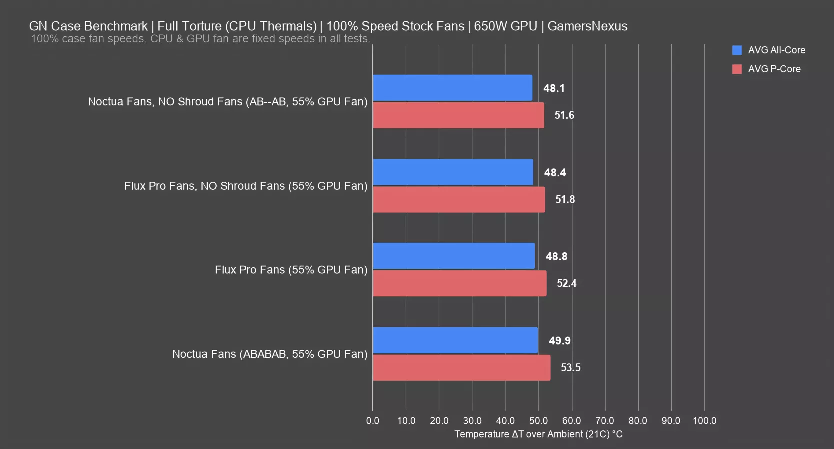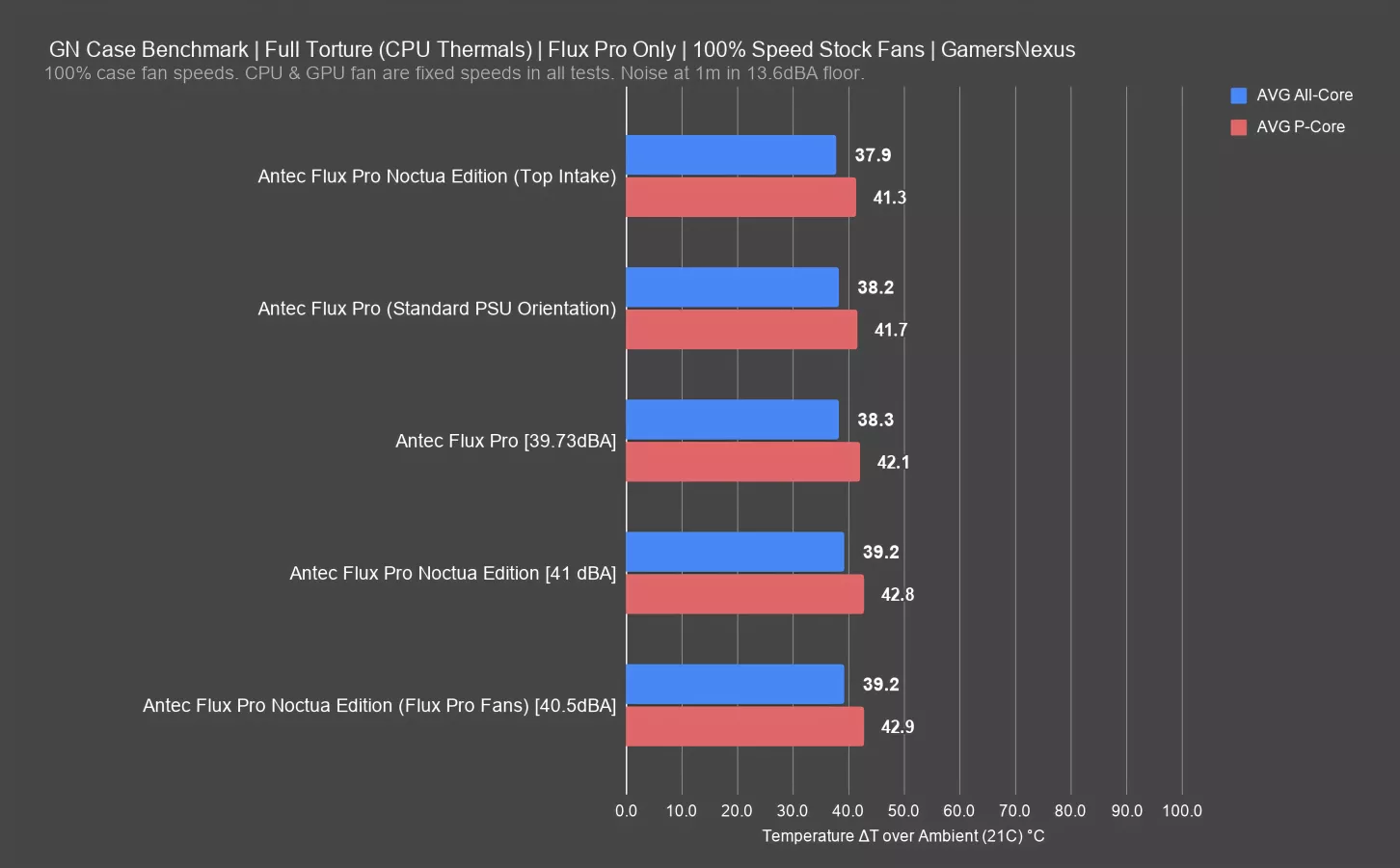 With or without the Noctua fans, but tested in the Noctua Edition version of the case with brand new data, the Flux Pro ended up at 39.2 degrees over ambient all-core and 42.8-42.9 for P-cores. The original result sat at 38.3, but again, that’s about 1 degree with a different case, different cable routing, and various other small changes that wouldn’t show in normal competitive reviews but might in a pure A/B like this.