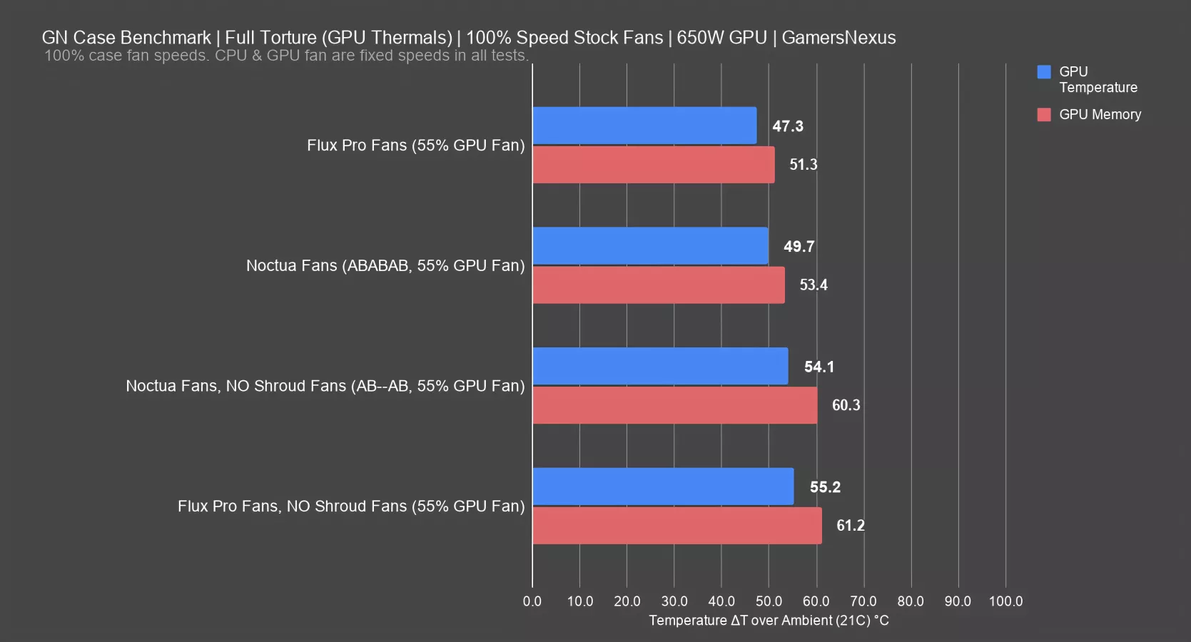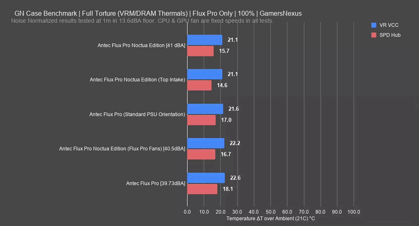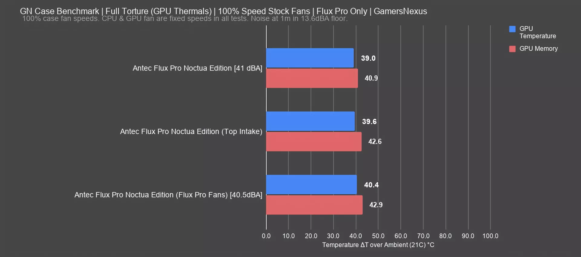 The configuration where we moved the shroud-top fan biased front to the top-front of the case as intake loses ground here, predictably, since it’s more designed to benefit the CPU than the GPU. The configuration held 39.6 degrees over ambient for the GPU temperature, which has it slightly better still than the default layout Flux Pro fans in the Noctua Edition Flux Pro case.