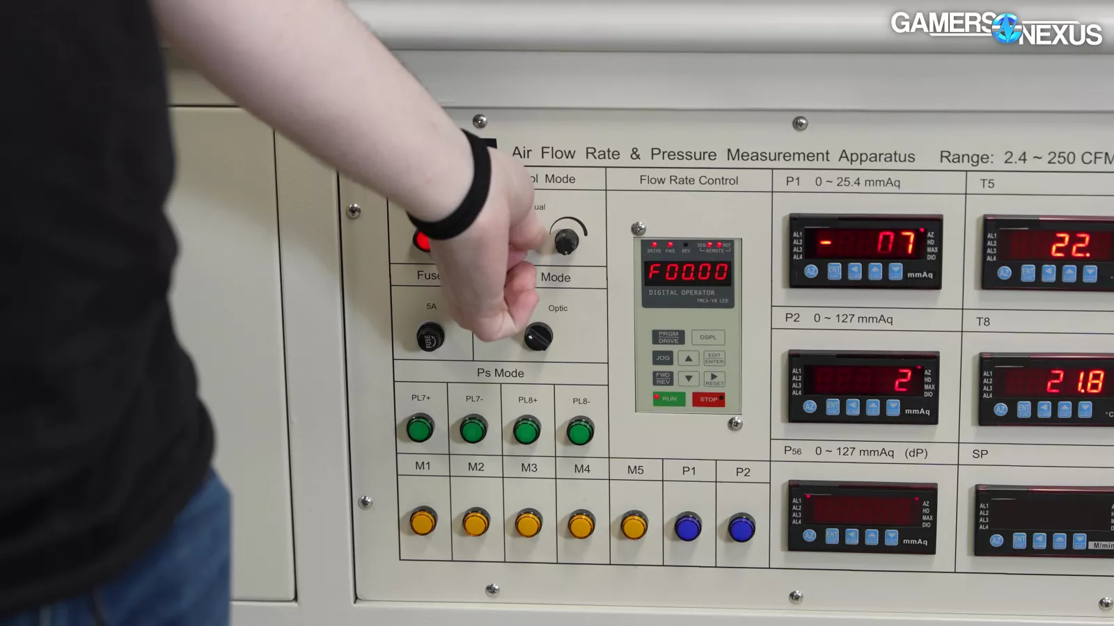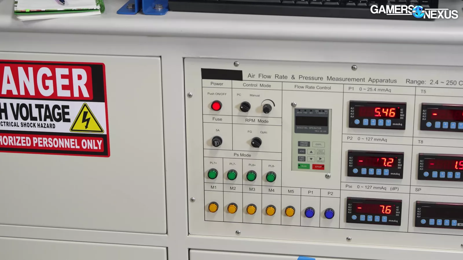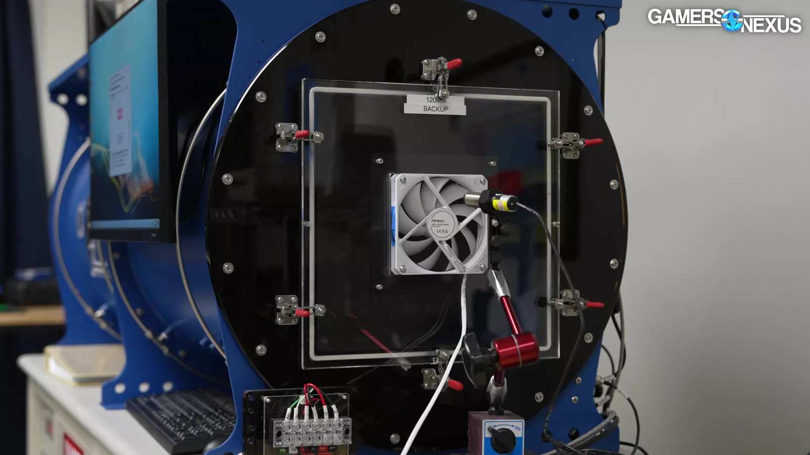 Special testing today includes using a fan tester. This is used for flow and pressure testing by using a counterblower located underneath the machine. We’re using this to get more detail on the Noctua and Antec fan differences, since they use the same count, size, and recommend the same placement. That means the fan itself is the primary difference in these case models, other than the color.