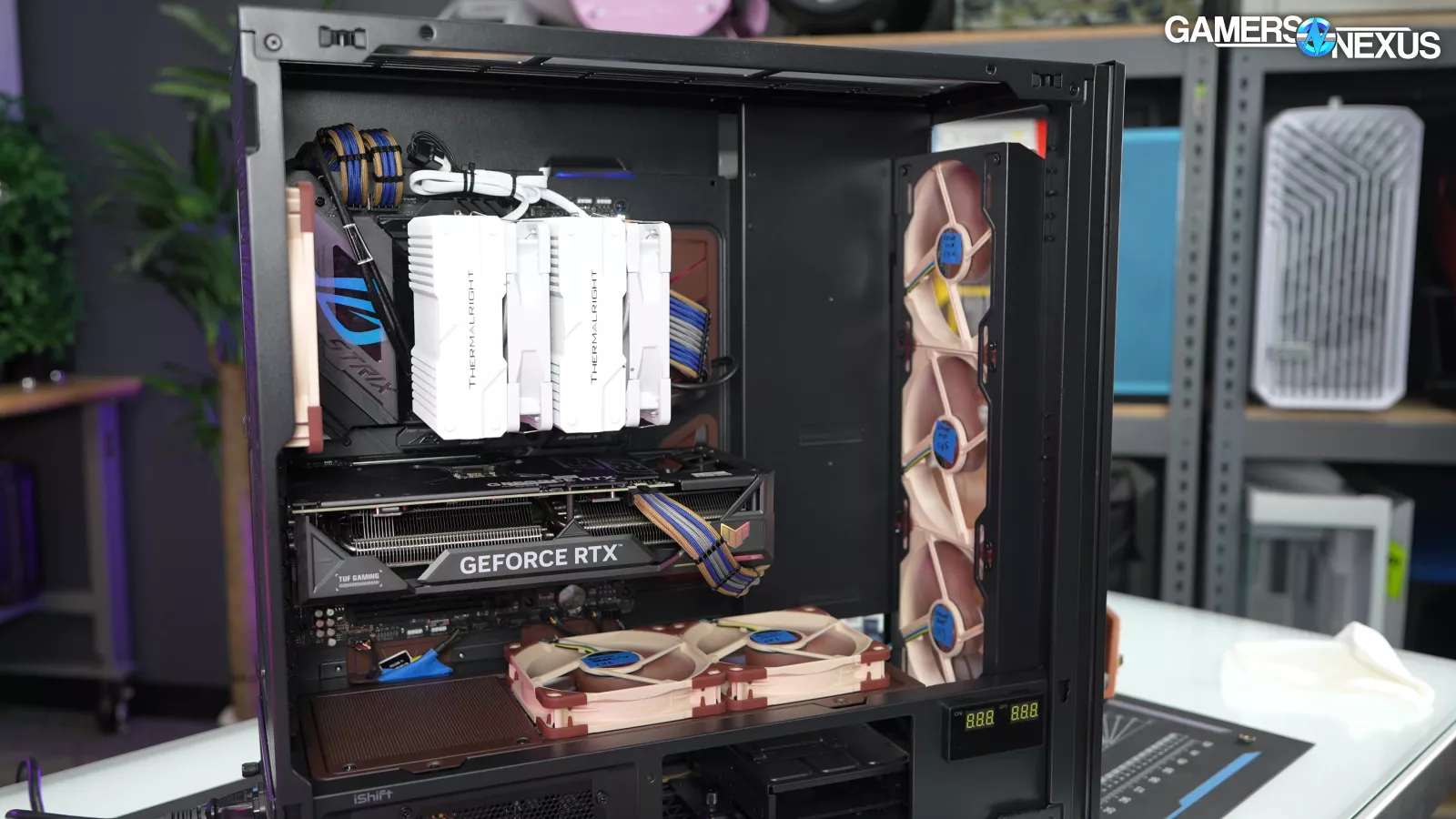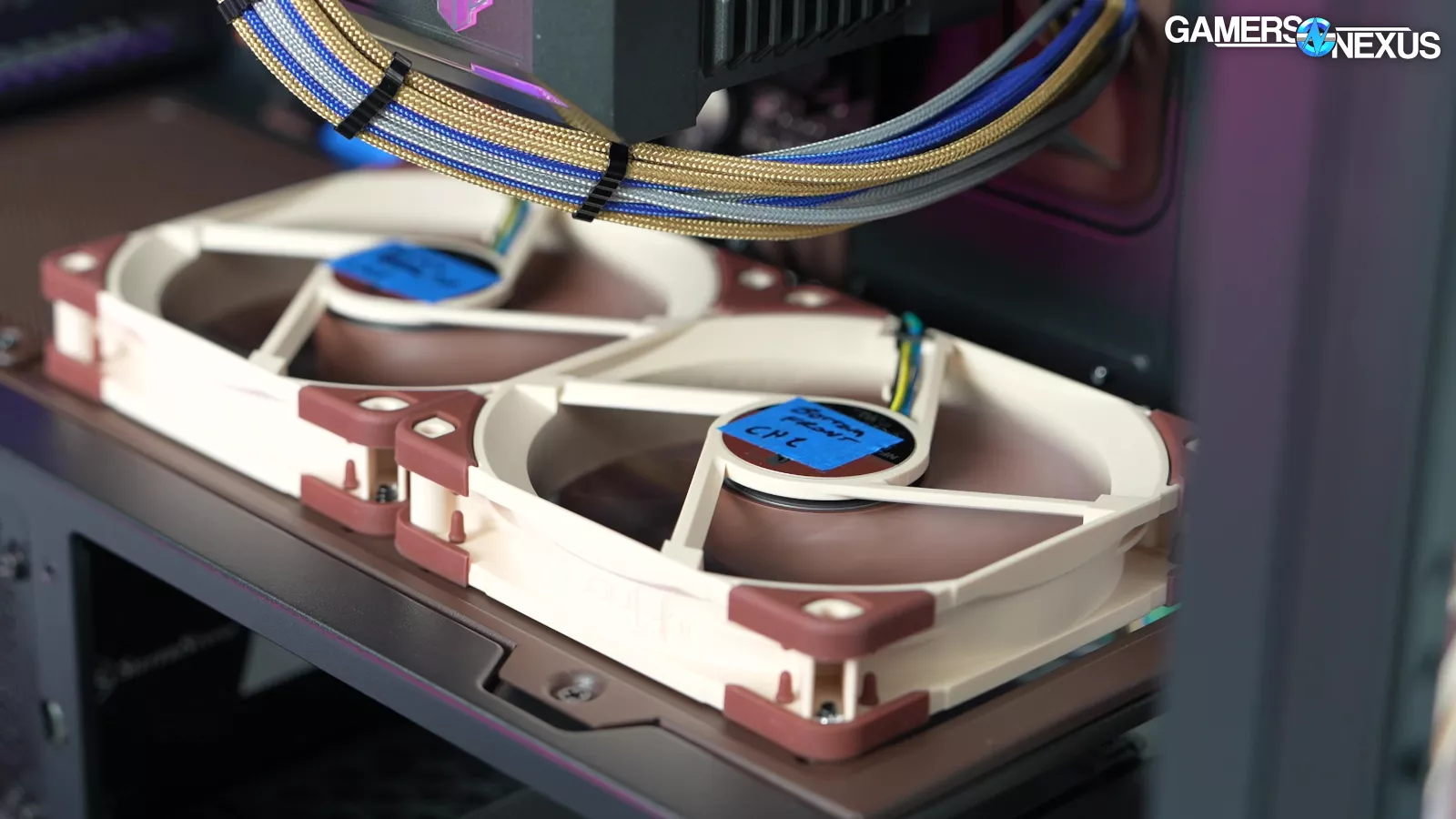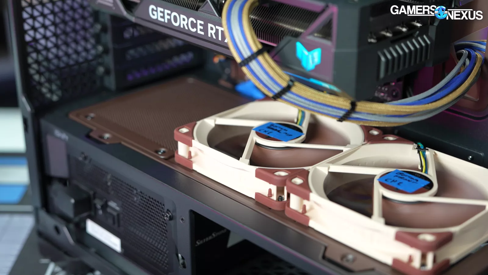 In a hunt to try and find improvement, we also ran tests with a custom-modified 650W monster of an RTX 5090. The CPU is running at 130W in this test, which is lower than Noctua’s 200W but is comparable to a 9800X3D with some basic tuning. The GPU is running at 650W, which is more than what Noctua tested with, through a power mod.