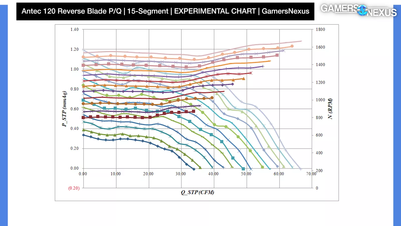 With that transparent, here’s a 15-segment P/Q chart for the Antec 120mm shroud-top reverse-blade fan. The maximum flow we measured at zero resistance was about 66 CFM. The maximum pressure we measured at 0 flow was about 1.19 mmH2O; however, neither of these situations is likely in the real world, as there will probably always be some pressure and some flow.