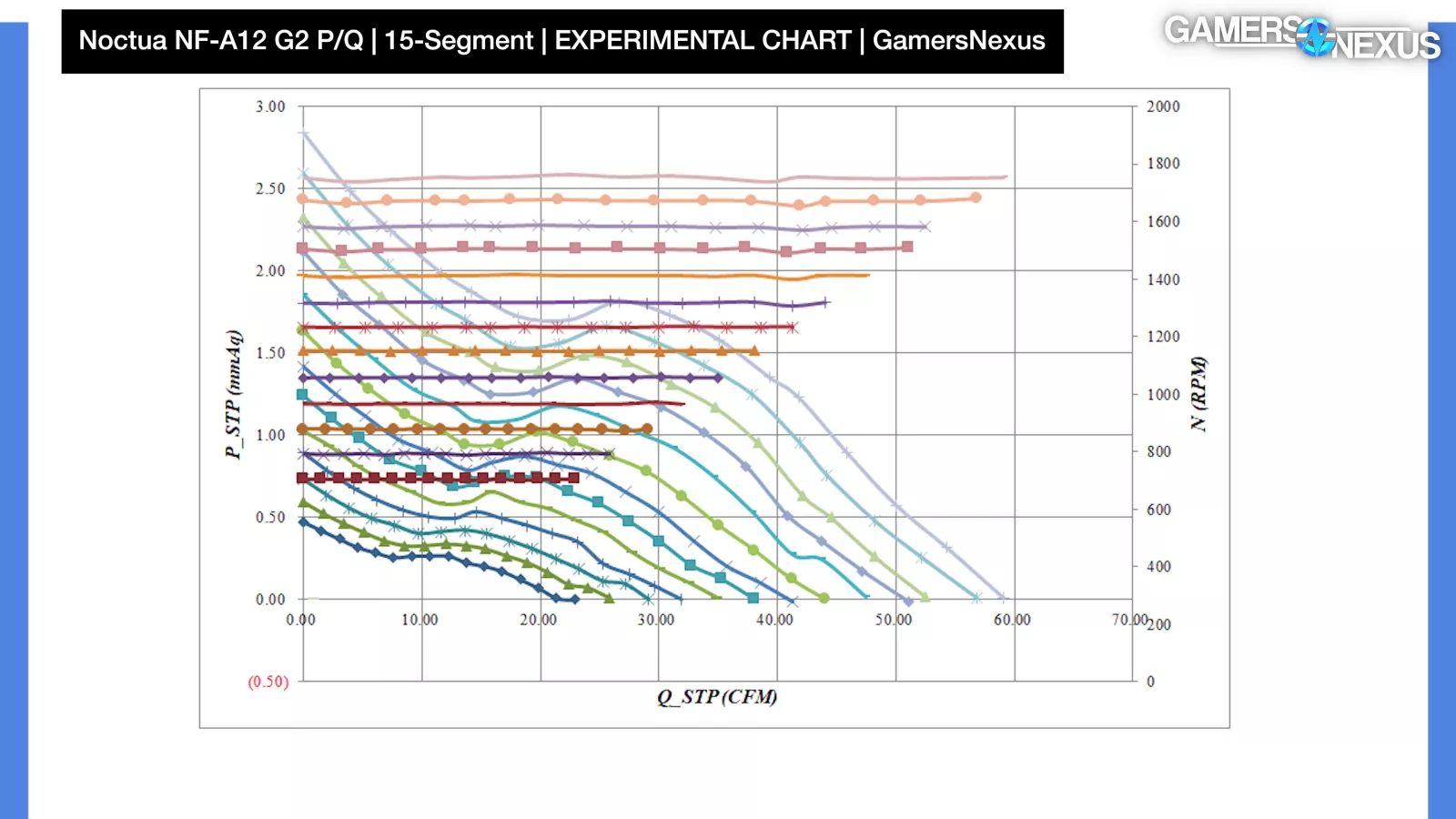For the last one, we’ll include some experimental charts from the fan testing machine. As with our HAVN BF 360 Flow review, we want to underscore that we do not yet possess the same level of experience with these charts or testing as our thermal benchmarks, and so our confidence in the data is lower and the data has a higher risk of having errors.