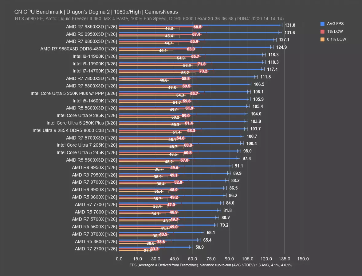 In this game, the 5600X3D and 5700X3D CPUs don’t do as disproportionately well as some other games. They’re still good, but the 250KP ends up ahead of them. As you’d expect, the 9800X3D and its refresh end up at the top of the chart but remain in a different price class.