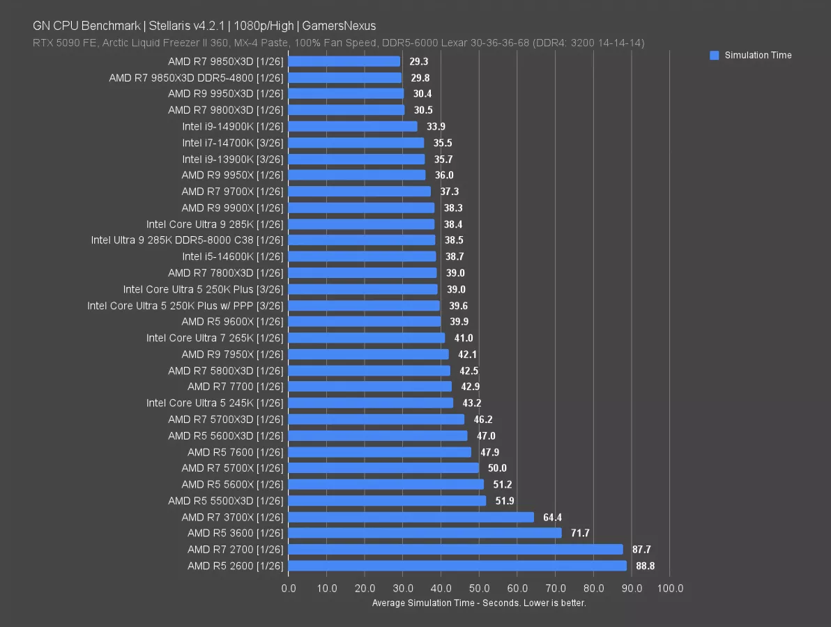 The 250KP outperforms AMD’s closest modern price comparison, the 9600X, by a few fractions of a second in the simulation test. These two are about the same in this test. The 250KP outdoes the 265K by about 1-2 seconds and the 5800X3D (watch our review) by about 2-3 seconds.