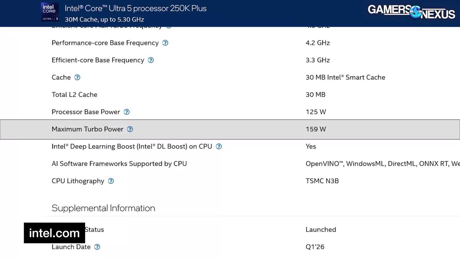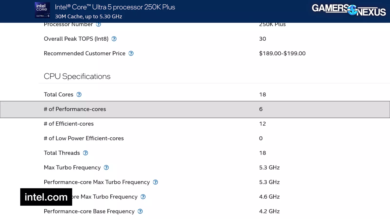 Intel’s new 250K Plus CPU is in the former i5 lineup and should be $190 to $200. The 250K Plus is running a 6 P-Core, 12 E-Core configuration for an 18C/18T spec at a 5.3 GHz max advertised boost. TDP is claimed at 159W for the 250K Plus, although TDP and actual power don’t match exactly. Intel is also now claiming native support for up to DDR5-7200 on the 250KP (up from 6400 previously), so... great, higher-end memory is supported.