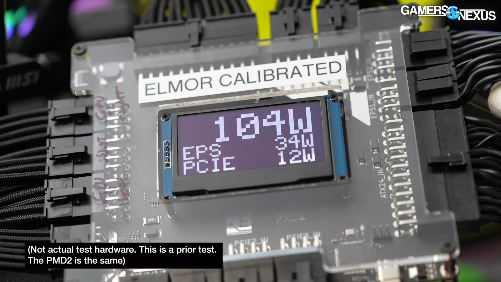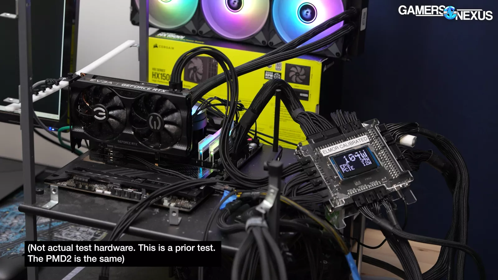 Now for our power test. This time, since the team was busy, we are keeping it pretty simple. For this testing, we set up a PMD2 as an interposer between the power supply and the test bench. So, there's an external capturing device. It captures all the power delivered to the bench because the motherboard we're using splits some of the 24 pin power to the CPU, which is abnormal. We take the ATX 12volt power, the EPS 12volt power, add them together, but we subtract out the PCIe slot, which we do by isolating the PCIe slot on a riser card strictly for this testing. So, that card is not there for the performance testing. And then we have some overhead for losses for VRM efficiency and other 12-volt parts on the board.