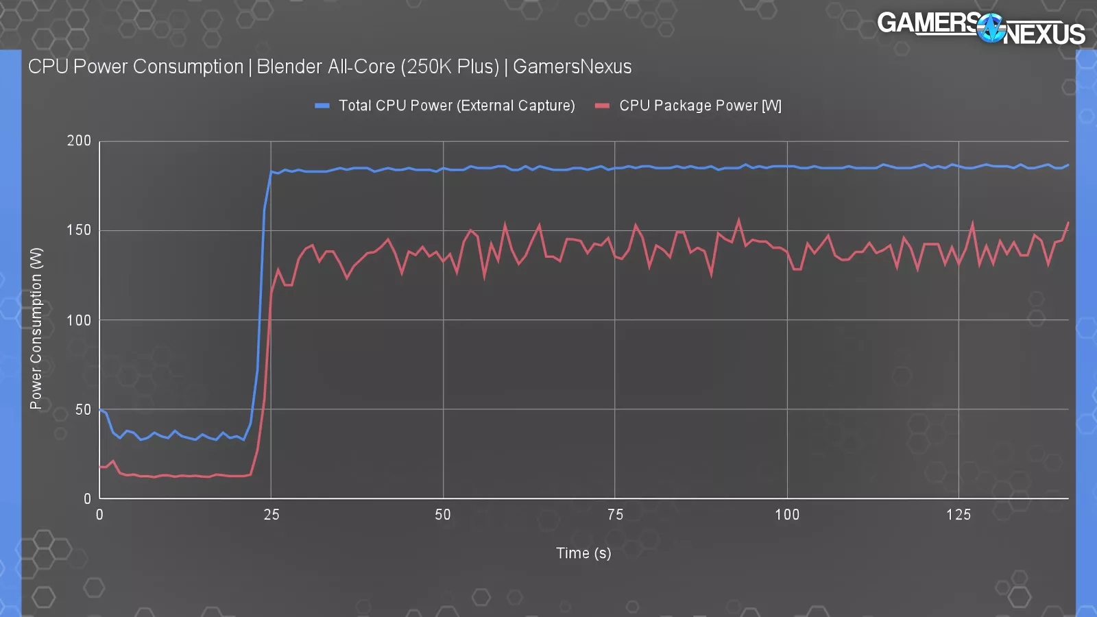 It's not perfect, but it works pretty well. This test shows power consumption of the 250K Plus during an allcore Blender workload, which will be the worst case power draw scenario for the CPU. The external capture utilities using the method described have us at about 186 watts for the CPU. VRM efficiency losses and miscellaneous board components. That's higher than TDP, but that's also expected when taking external measurements. For reference, a CPU package power measurement using hardware info software yields around 140 to 150 watts in the same test.
