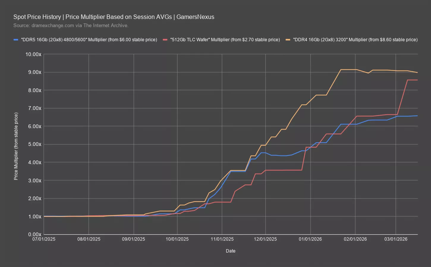 This chart plots spot price session AVGs from July 2025 to March 2026 for DDR5 16Gb, 512Gb TLC, and DDR4 16Gb. We collected this data using the Internet Archive to compile a brief spot price history as updated on dramexchange.com. These are supply costs. Contract prices are often different, but spot prices give us an idea for upstream supply chain pricing.