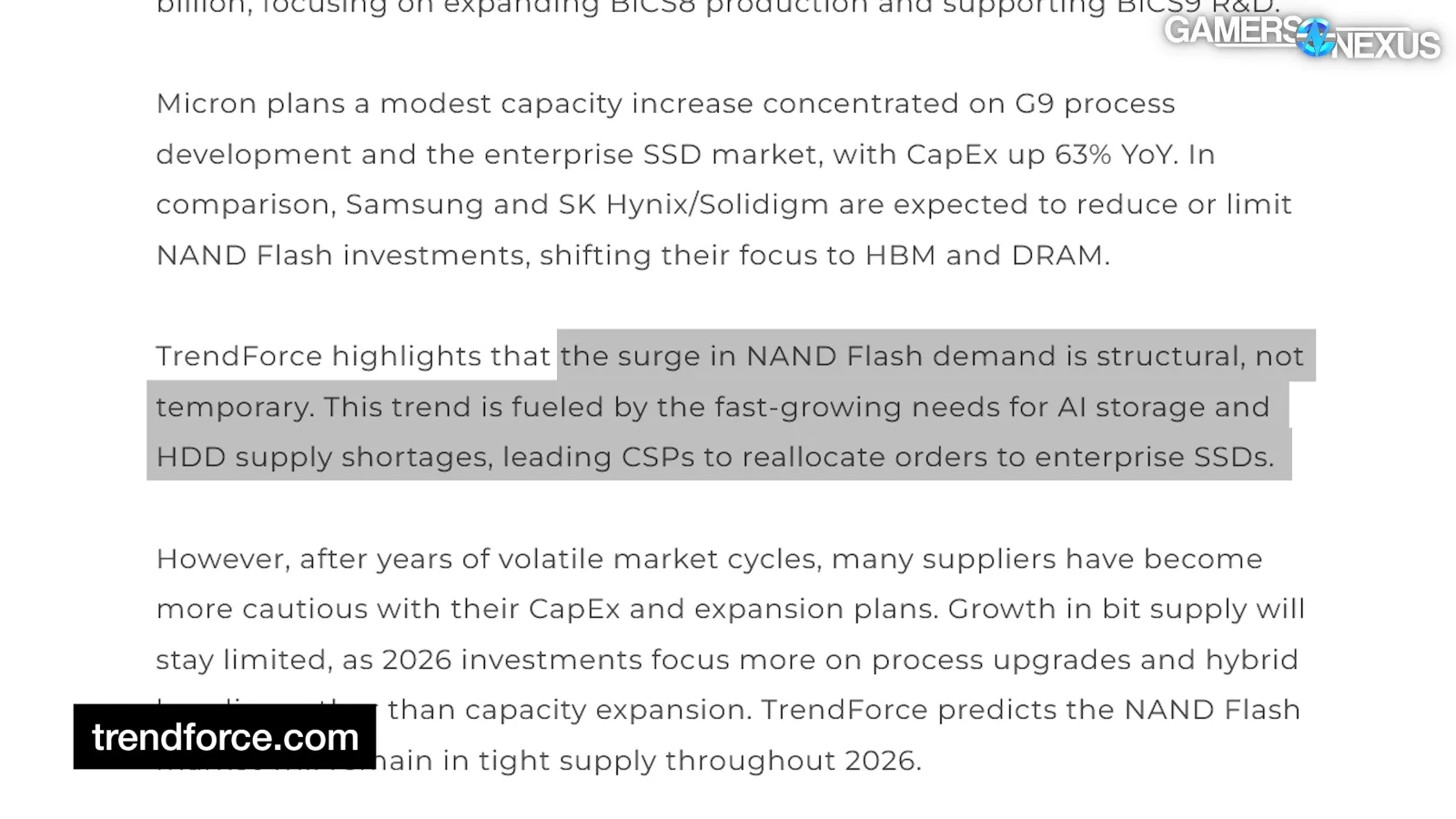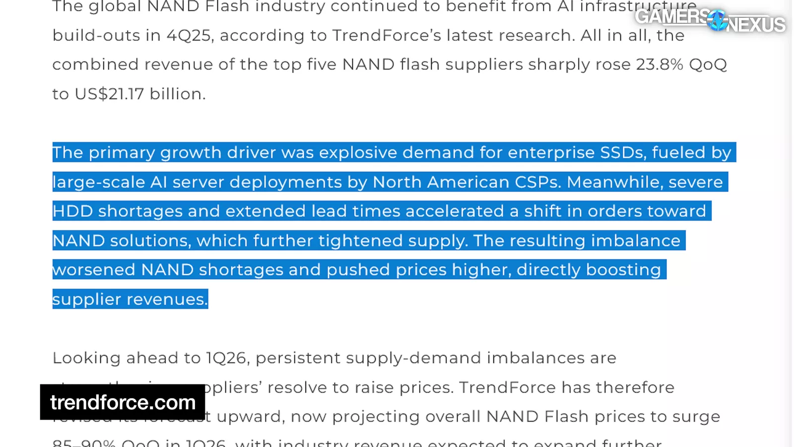 “TrendForce notes that with limited near-term NAND capacity expansion and surging AI demand, pricing momentum is expected to remain strong throughout 2026.”
