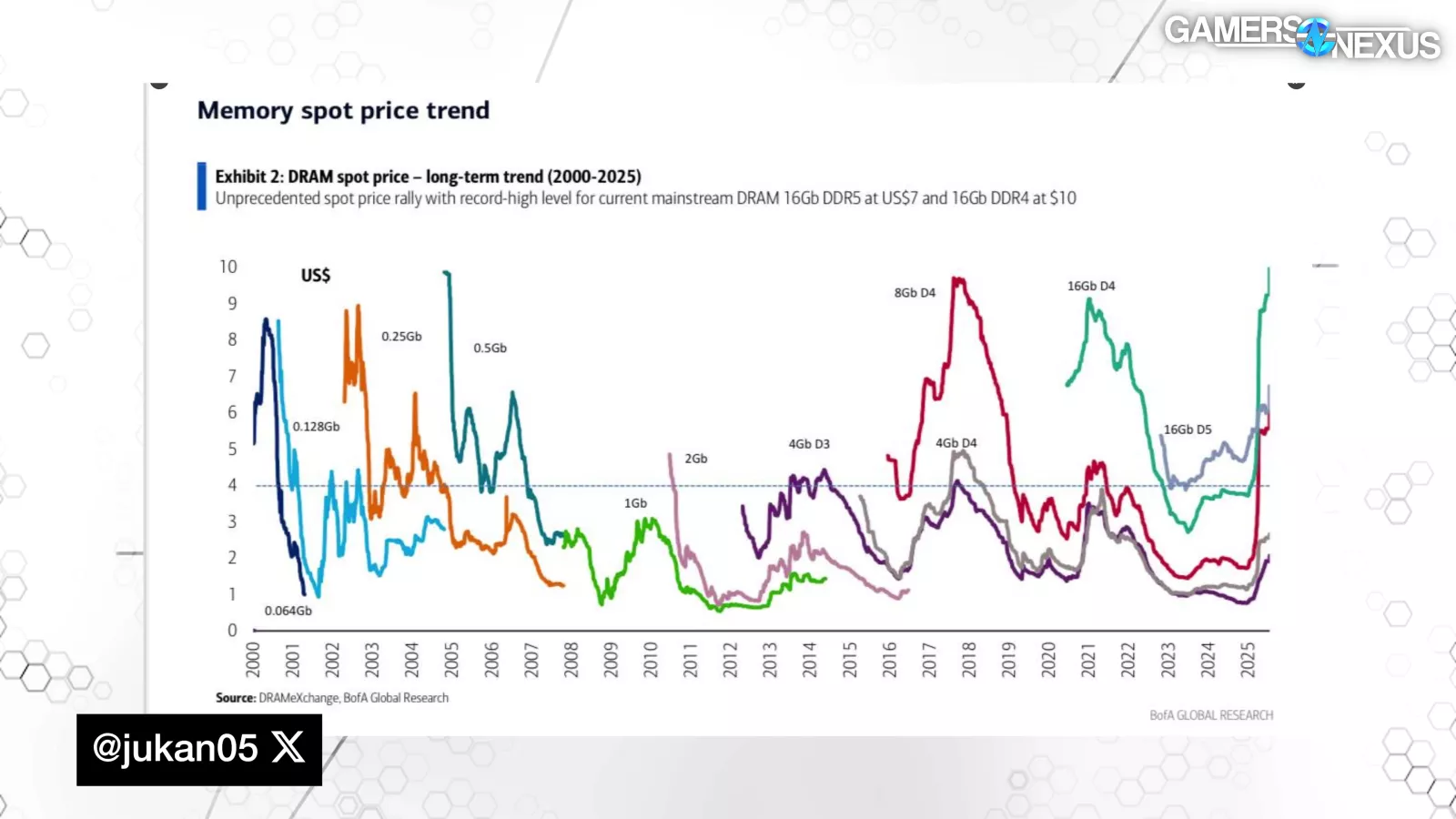 DDR5 16Gb’s session AVG at slower speeds surpassed its previously stable price by 2x just before November, exceeded both 3x and then 4x in November (which is when we made our RAM: WTF? video), and shot 5x and 6x past its previously stable price in January, gradually increasing since. It currently is approaching a 7x multiplier.