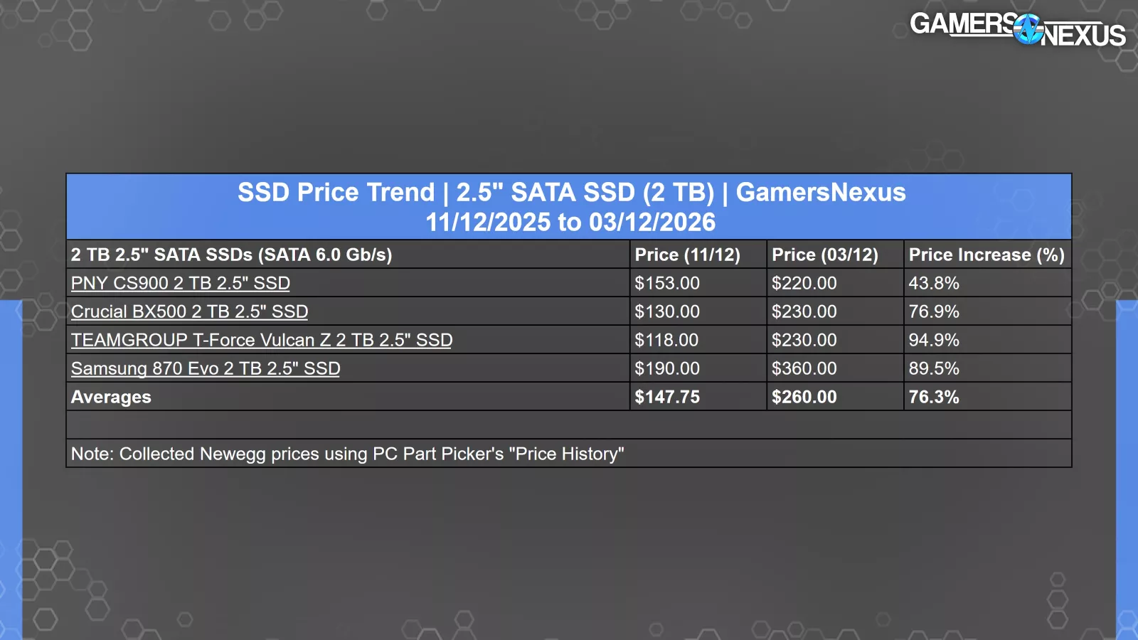 | SSD Price Trend | 2.5" SATA SSD (2 TB) | GamersNexus11/12/2025 to 03/12/2026 | |||