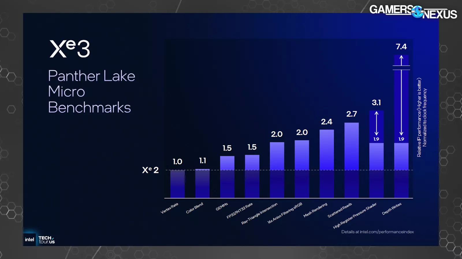 In Xe3 for “depth writes,” Intel says it saw a 7.4x relative performance improvement normalized to clock frequency. We’re not certain, but our understanding is that this is not isolated for configuration size. This means that this isn’t a perfect comparison since the Xe core count is different between Xe2 and Xe3 in these tests. This 7.4x improvement outstrips the change in configuration size, though.