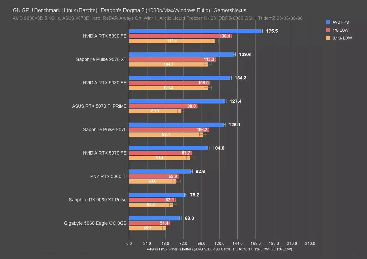 We’ll start with the Windows build of Dragon’s Dogma 2 at 1080p/Max settings. For this testing, we used KDE Plasma 6.4.4, KDE Framework 6.17.0, Qt 6.9.2, Wayland, and 10.0-2e Proton, except the 9070 XT (read our review) and 5070 Ti (read our review), which ran earlier and were both experimental 10.0-20250919.