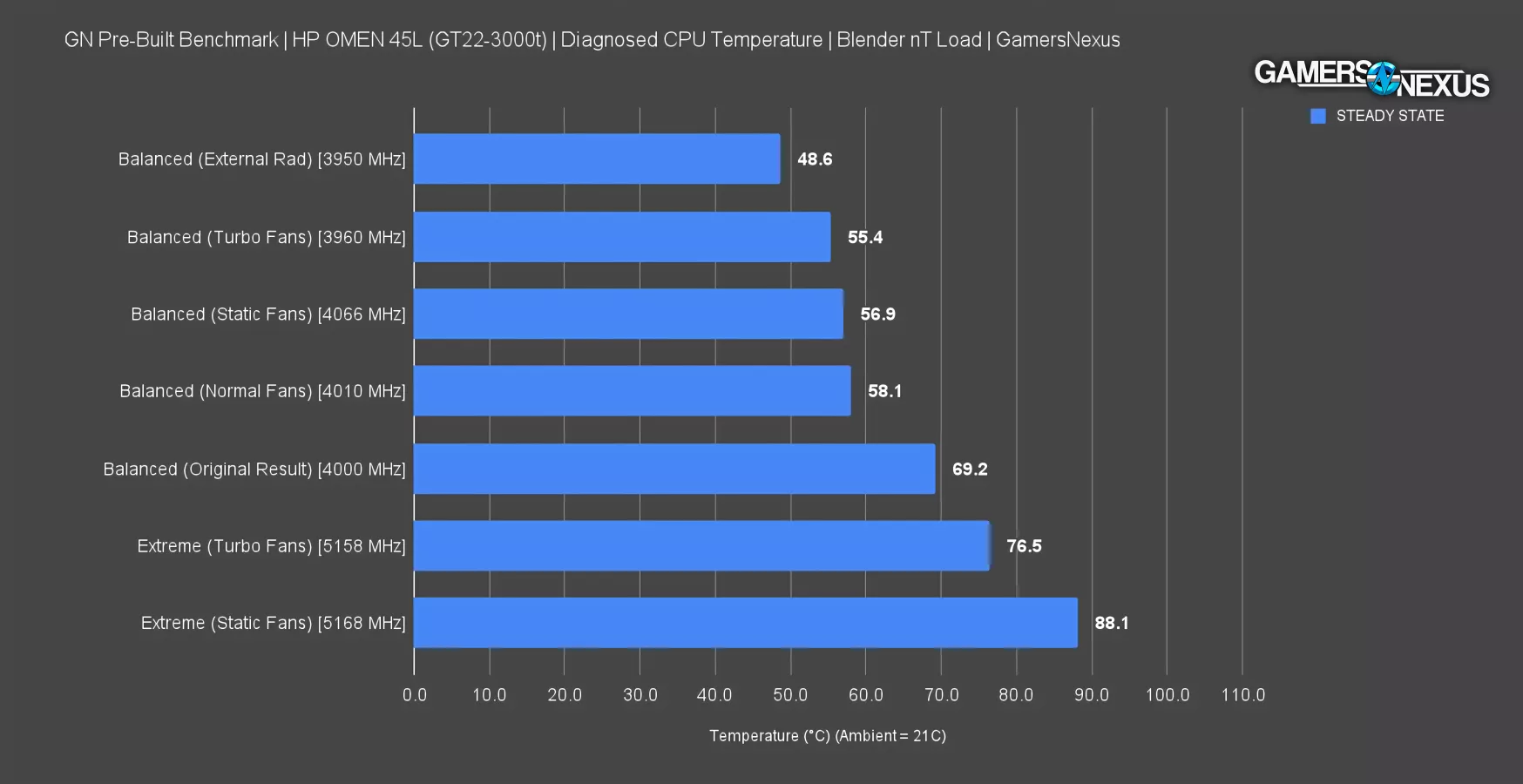 Their so-called “cryo chamber” is seriously hurting performance, anyway: By removing the radiator from its mummifying wrap and enclosed tomb of impedance, we reduced the temperature like-for-like by about 10 degrees Celsius. That is a huge improvement for something that’s supposed to be “Cryo.” If HP had mounted the radiator to the front of the case and put it behind a mesh panel, it’d probably split the difference here; instead, its patented gimmick is running the system hotter, which is contributing to their likely concern of noise levels if they were to run it properly. A better radiator location and chamber would reduce temperature, which would allow them to achieve the same thermals for similar noise, which would allow them to boost the CPU frequency.