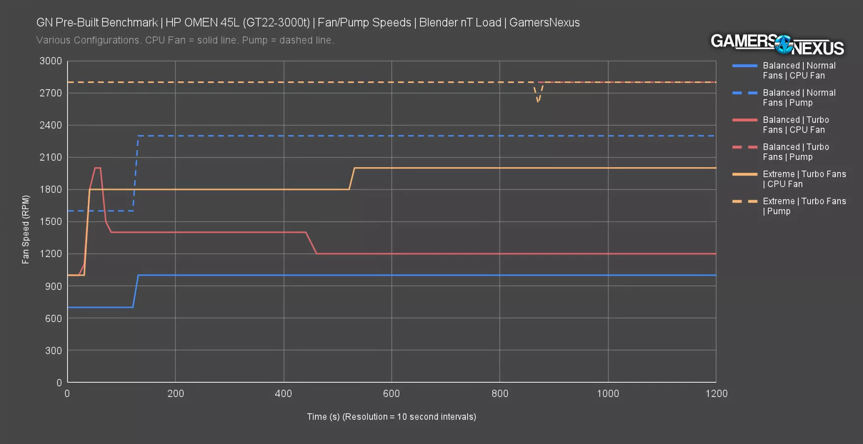 This simple fan/pump speed chart shows the speed of the pump, shown with the hyphenated line, juxtaposed with fan speed. The line colors match for the profile. The Extreme profile maintains the 2800 RPM reported pump speed for the duration of the test, which helps maintain the thermal results we just saw and the clocks closer to expectation. It still failed, but the clocks are closer.