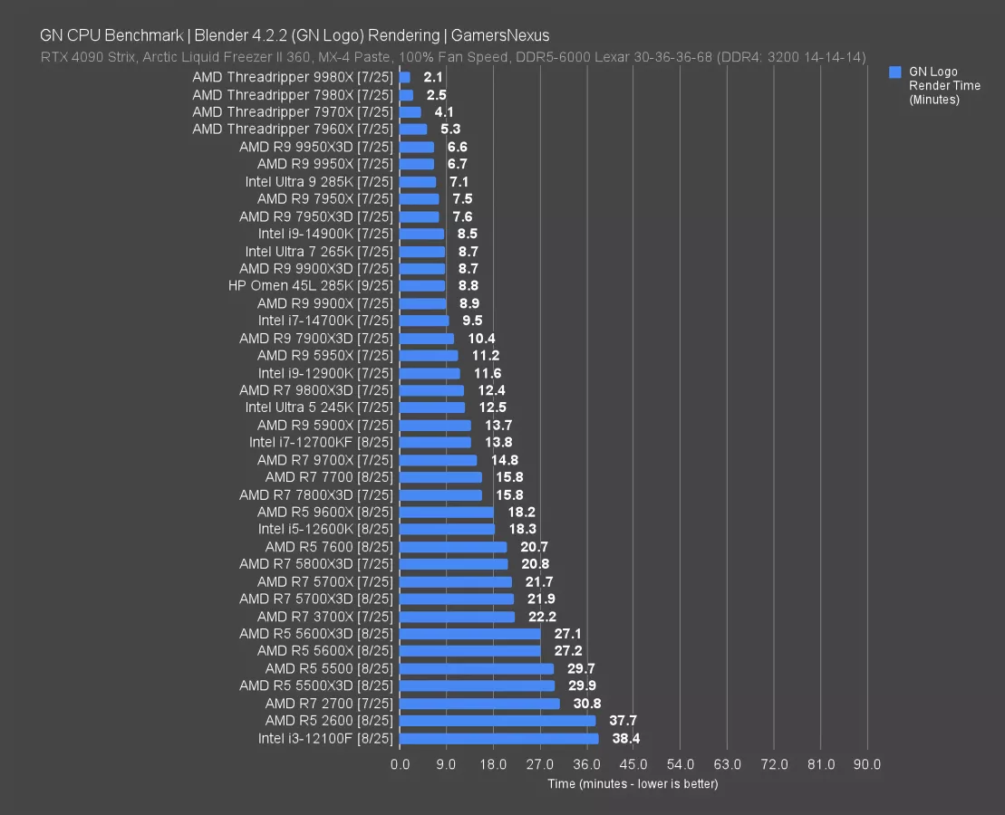We ran the Omen build through our standardized Blender CPU rendering benchmark to see how much performance was lost. The 285K requires 7.1 minutes to complete the render in our normal testing, with the Omen version of the 285K requiring 8.8 minutes. This is such a huge reduction in performance that HP has managed to make it worse than a 265K (read our review) despite having 4 more threads. It’s hardly better than a 14700K (read our review). This is impressively bad and means that you’re paying at least the difference of a 265K to a 285K, yet getting 265K performance.