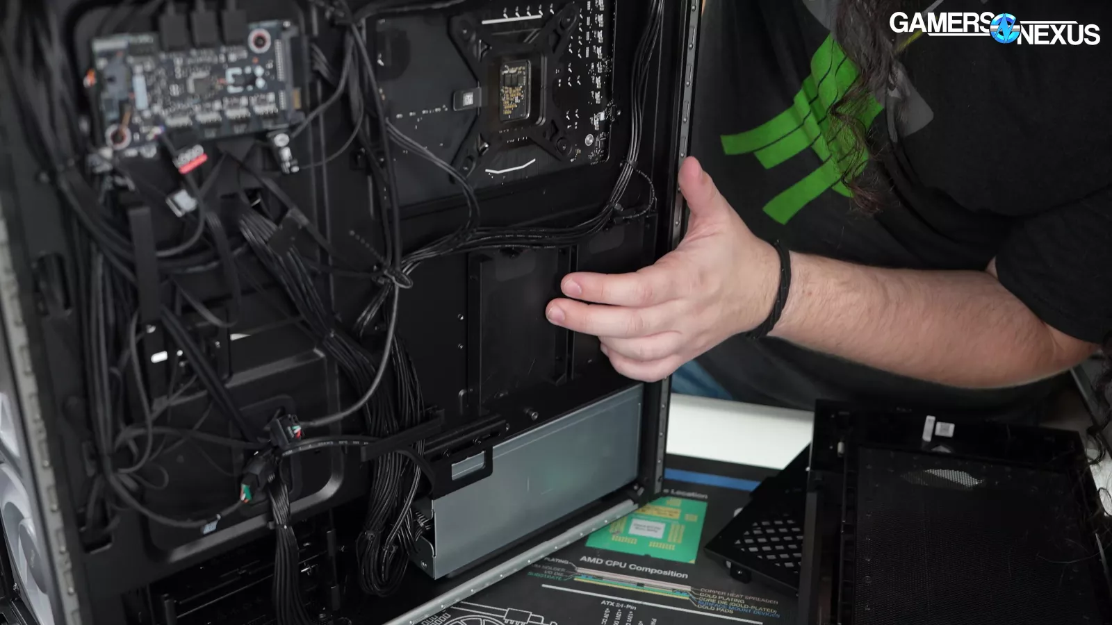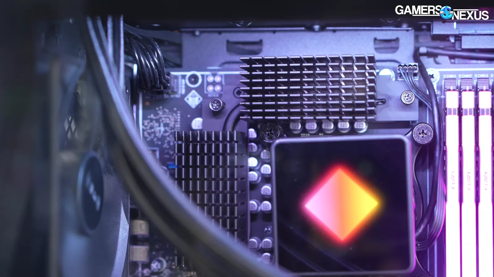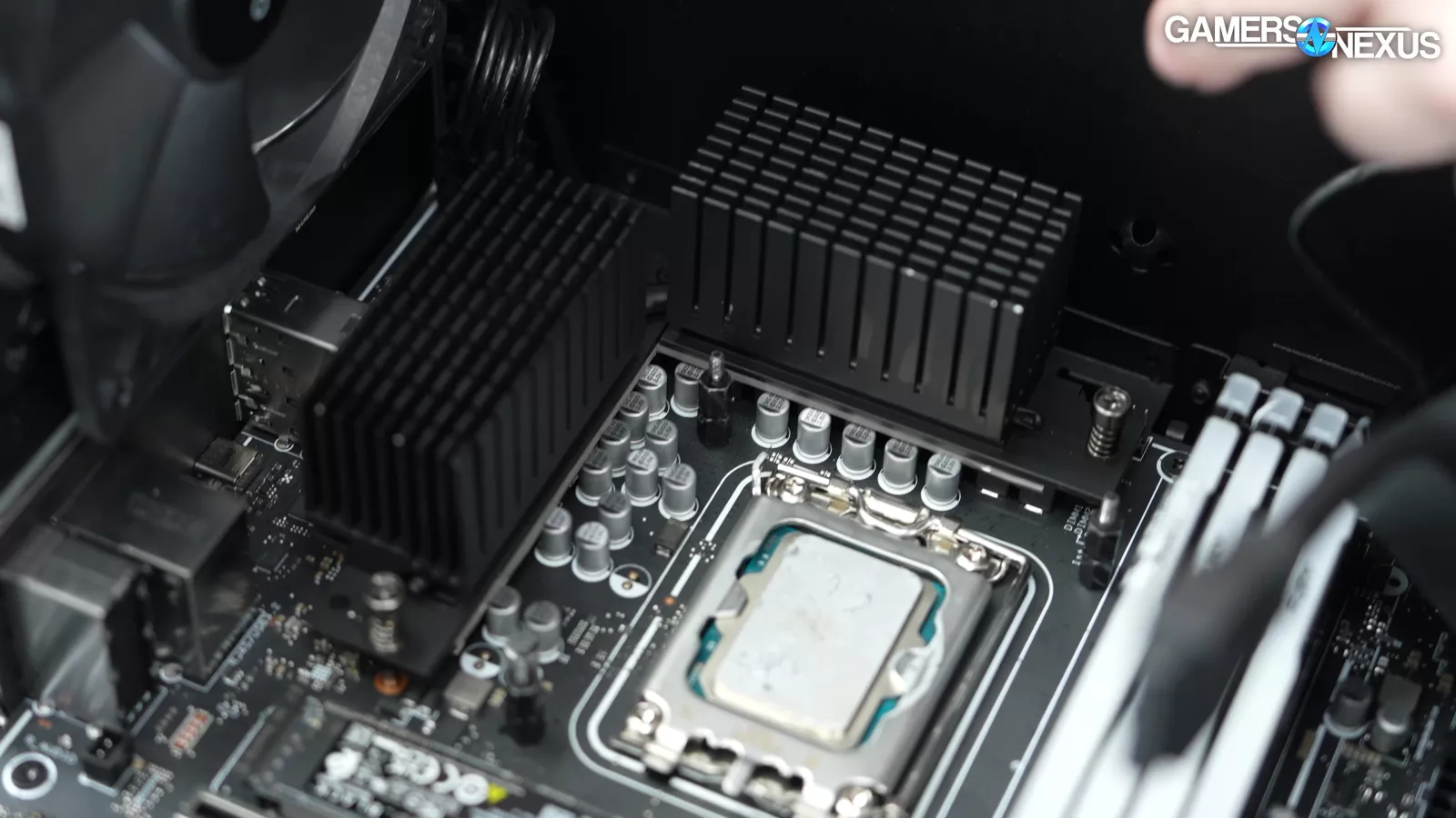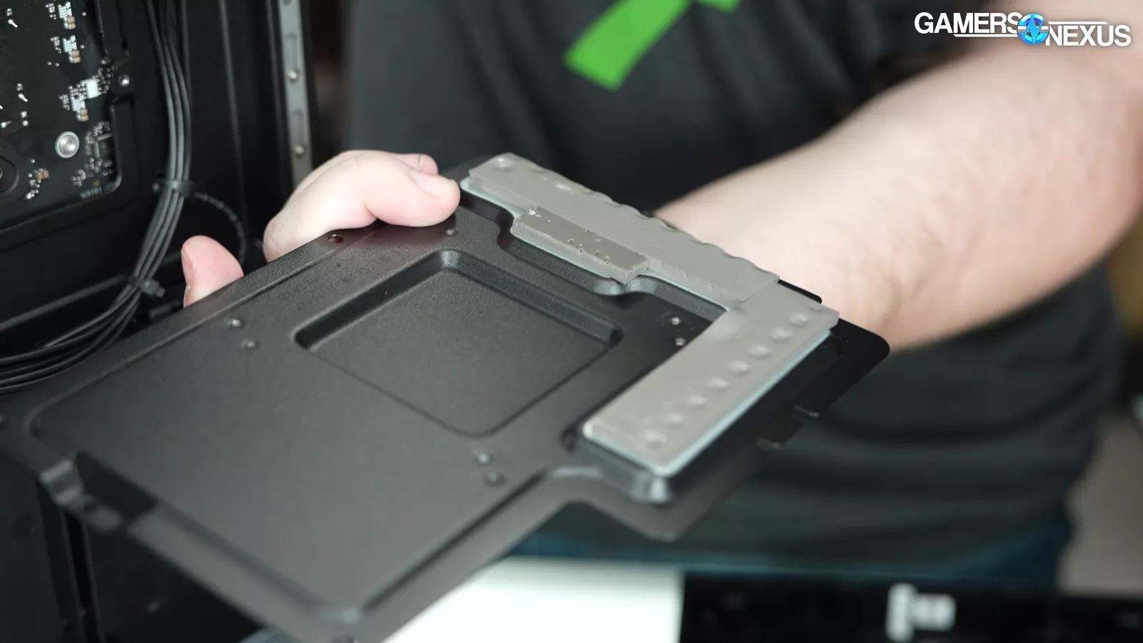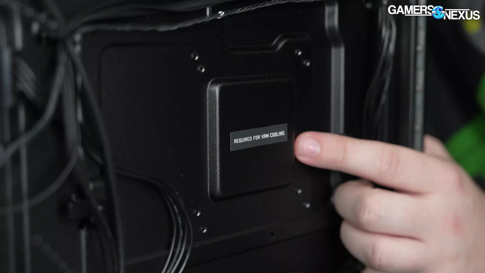 Removing the back side panel, we noticed a plate that said “required for VRM cooling,” which we proceeded to take off. This exposed some thermal pads for the VRM mosfets, which is a nice touch, but it’s hard to appreciate when the CPU runs up to 105 degrees Celsius.