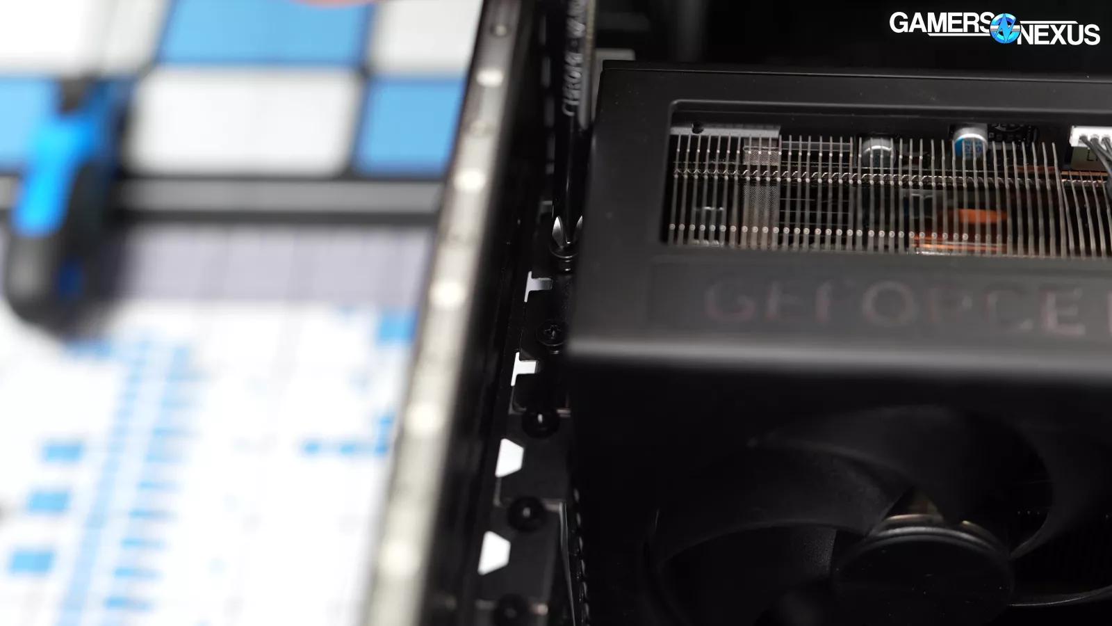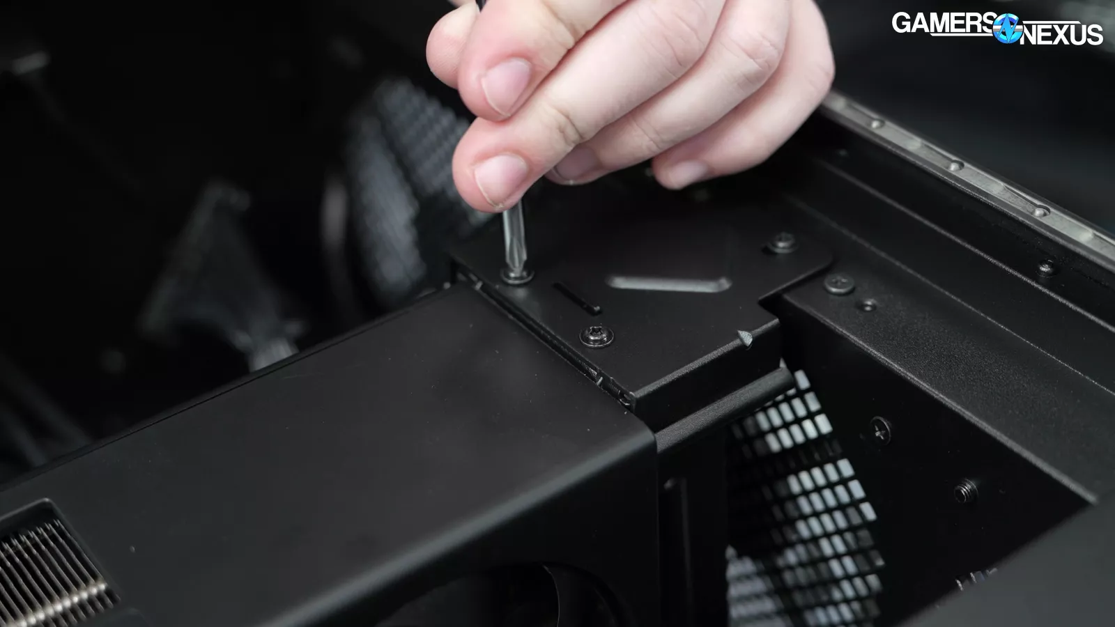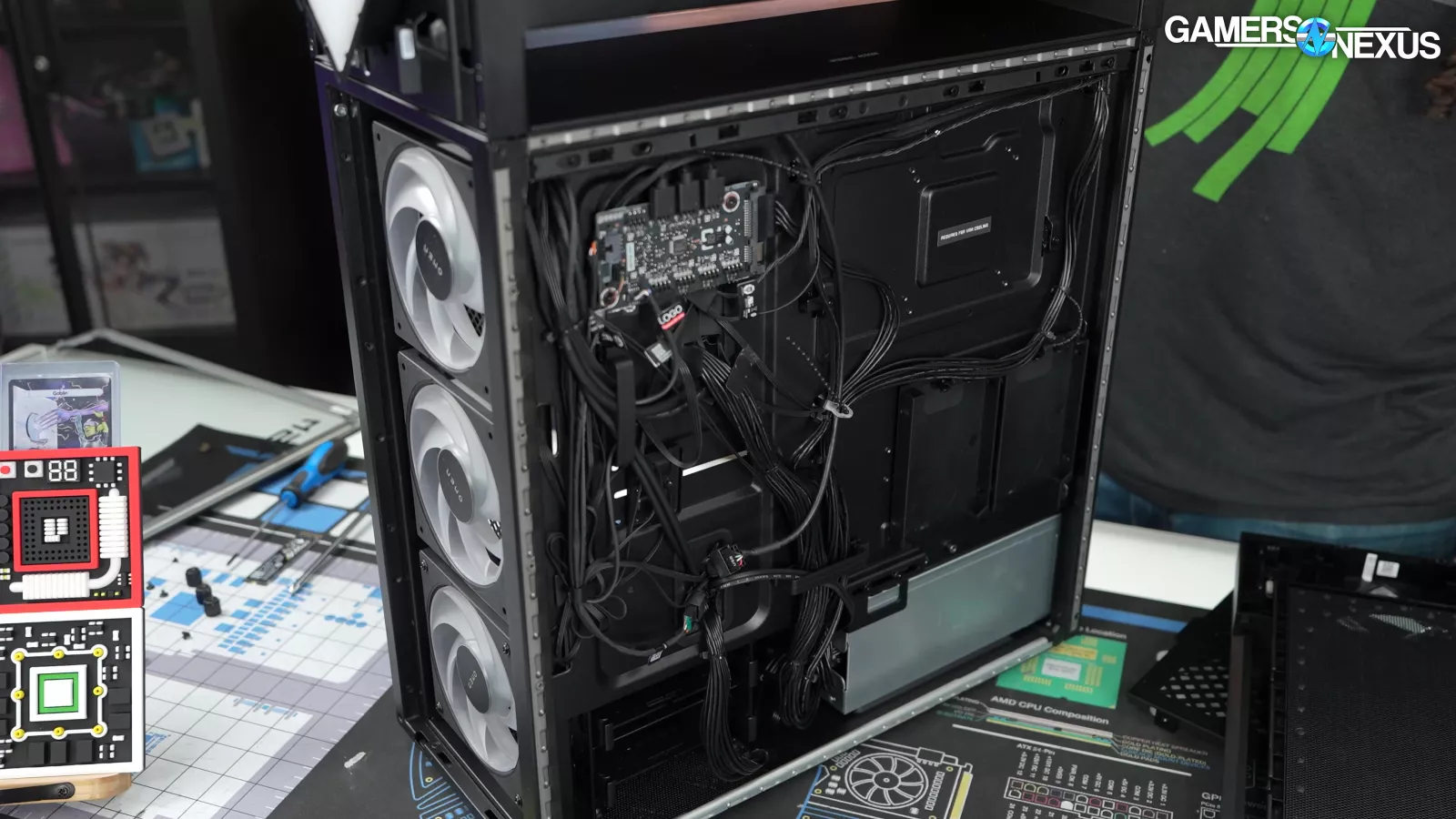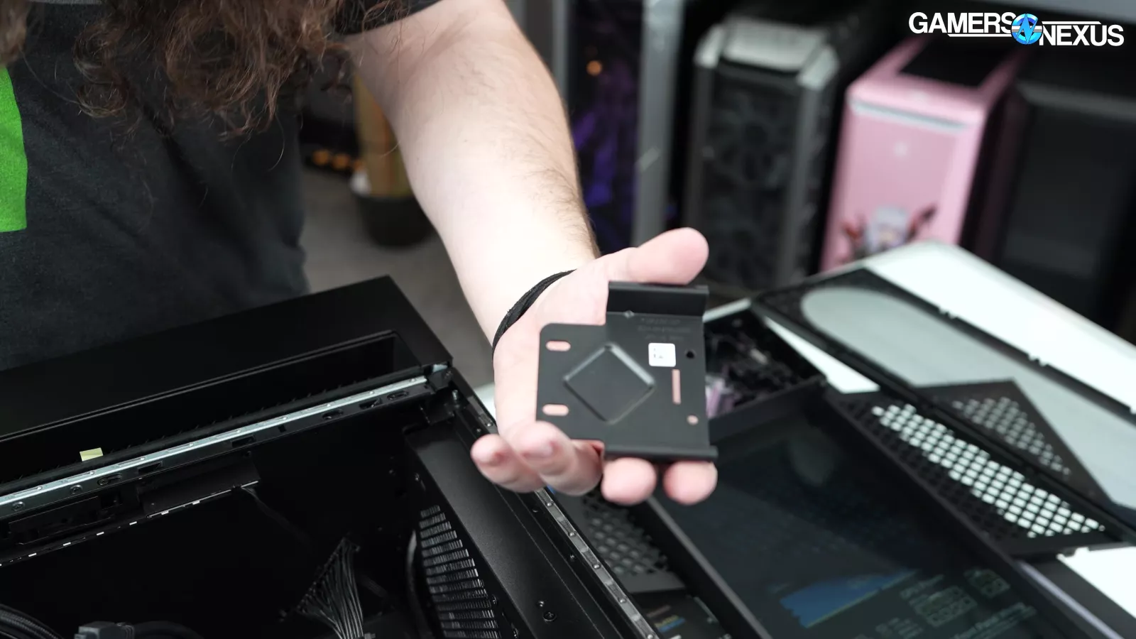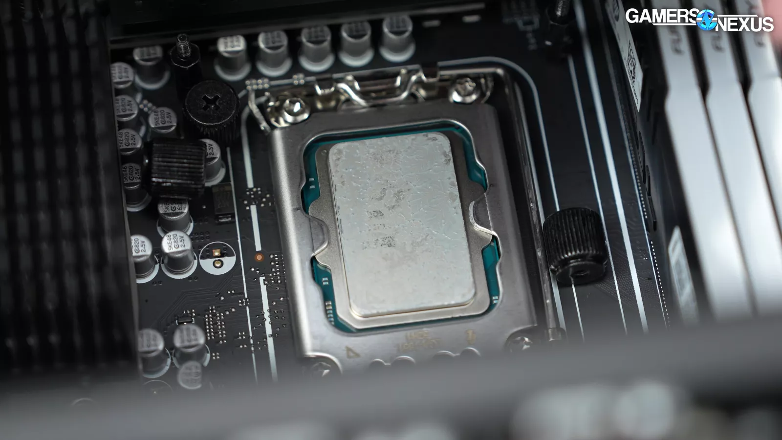 Removing the back side panel, we noticed a plate that said “required for VRM cooling,” which we proceeded to take off. This exposed some thermal pads for the VRM mosfets, which is a nice touch, but it’s hard to appreciate when the CPU runs up to 105 degrees Celsius.