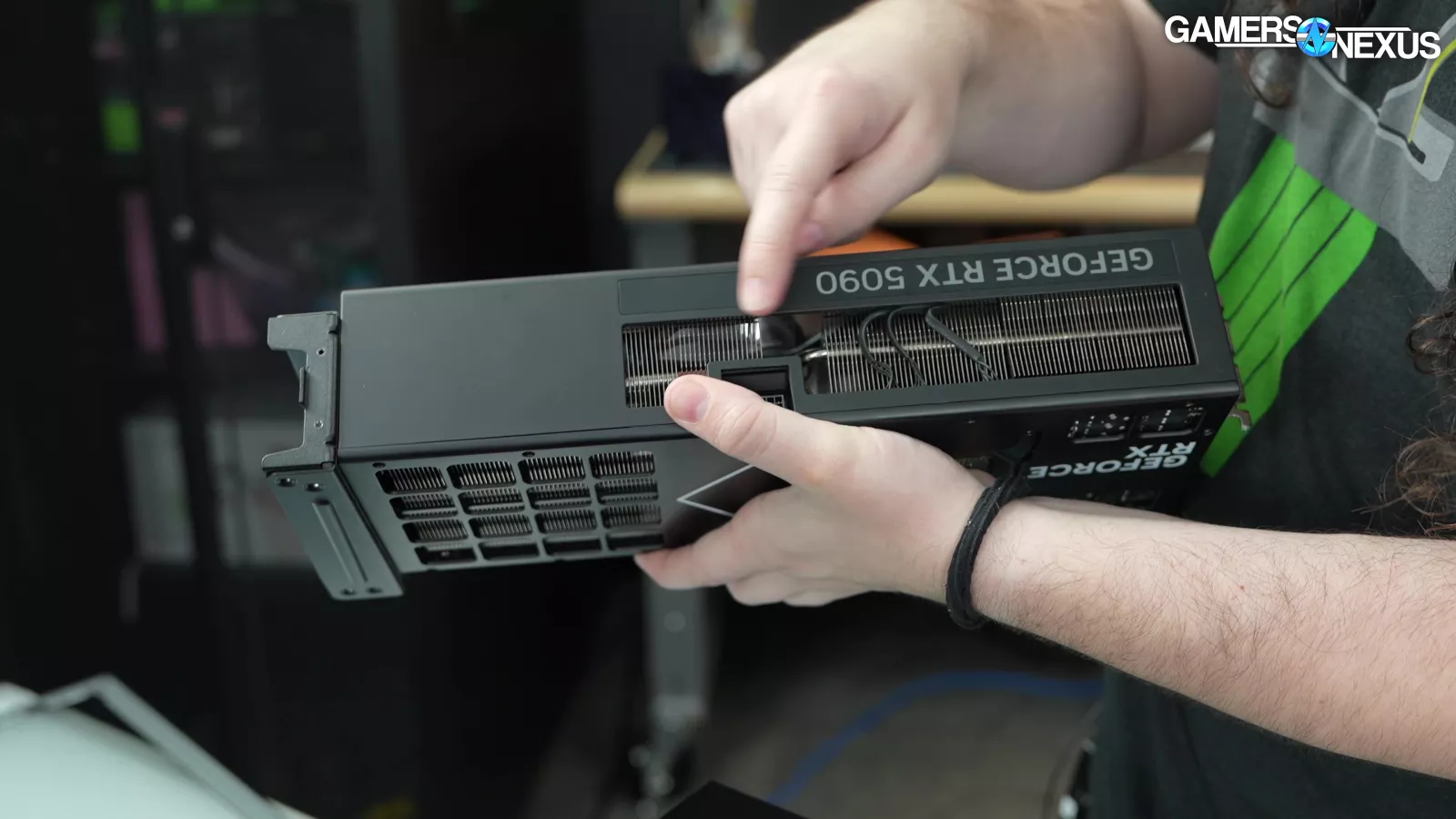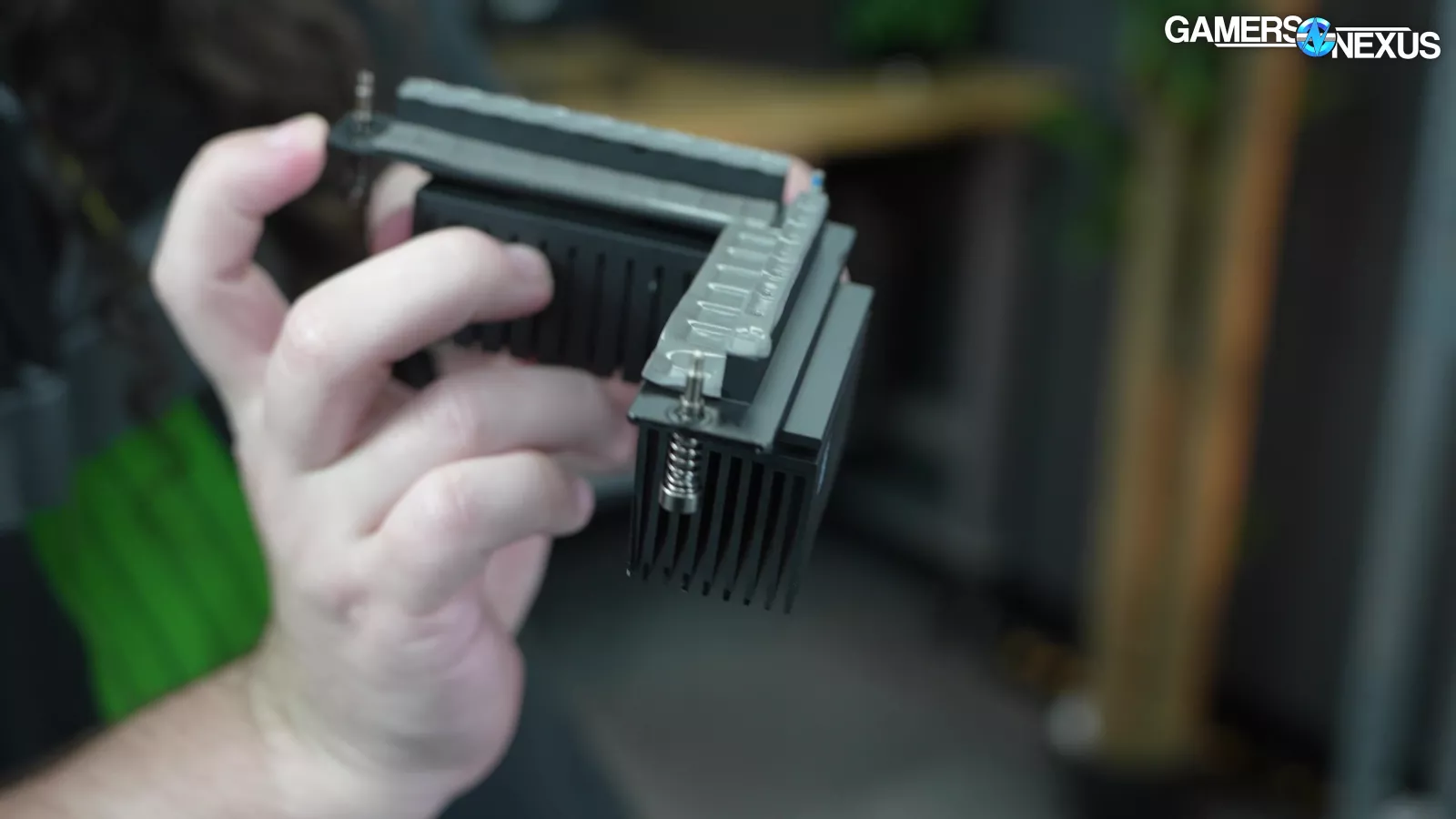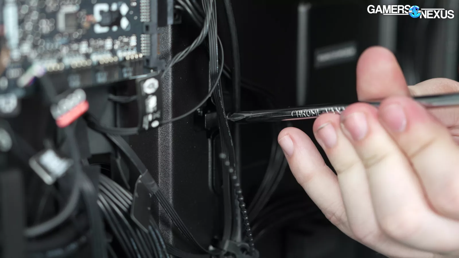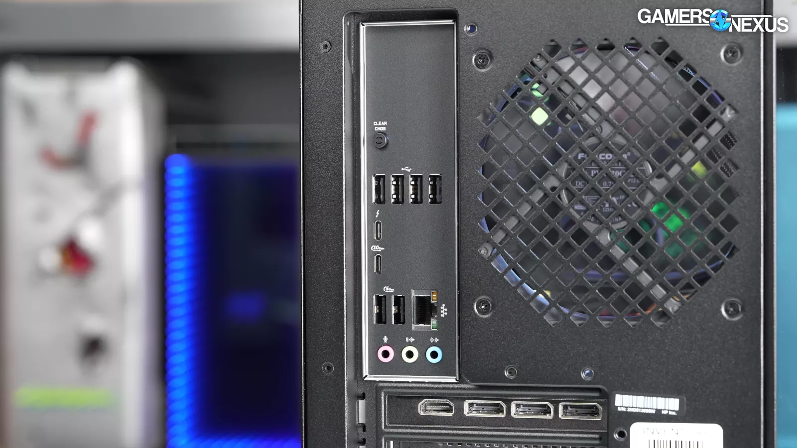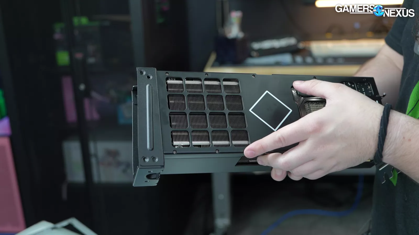 Removing the back side panel, we noticed a plate that said “required for VRM cooling,” which we proceeded to take off. This exposed some thermal pads for the VRM mosfets, which is a nice touch, but it’s hard to appreciate when the CPU runs up to 105 degrees Celsius.