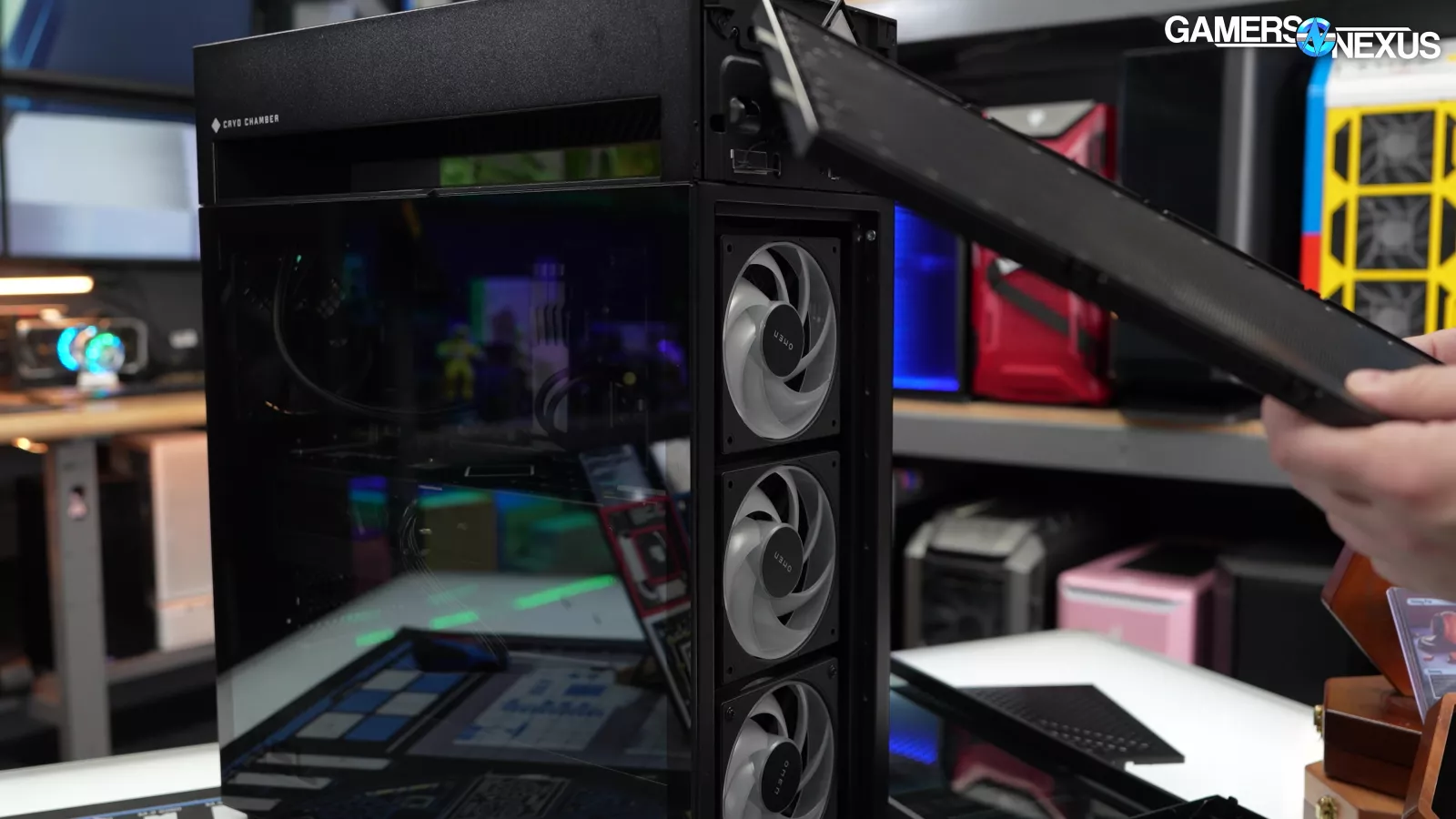 At the front of the case, there are 2 buttons along both sides of the front panel, which allows users to take it off. It’s very complicated with some release mechanisms. Pulling the front cover off, however, reveals the case’s front fans and highlighted to us how the fans here have less than an inch of airflow. This design hinders performance.