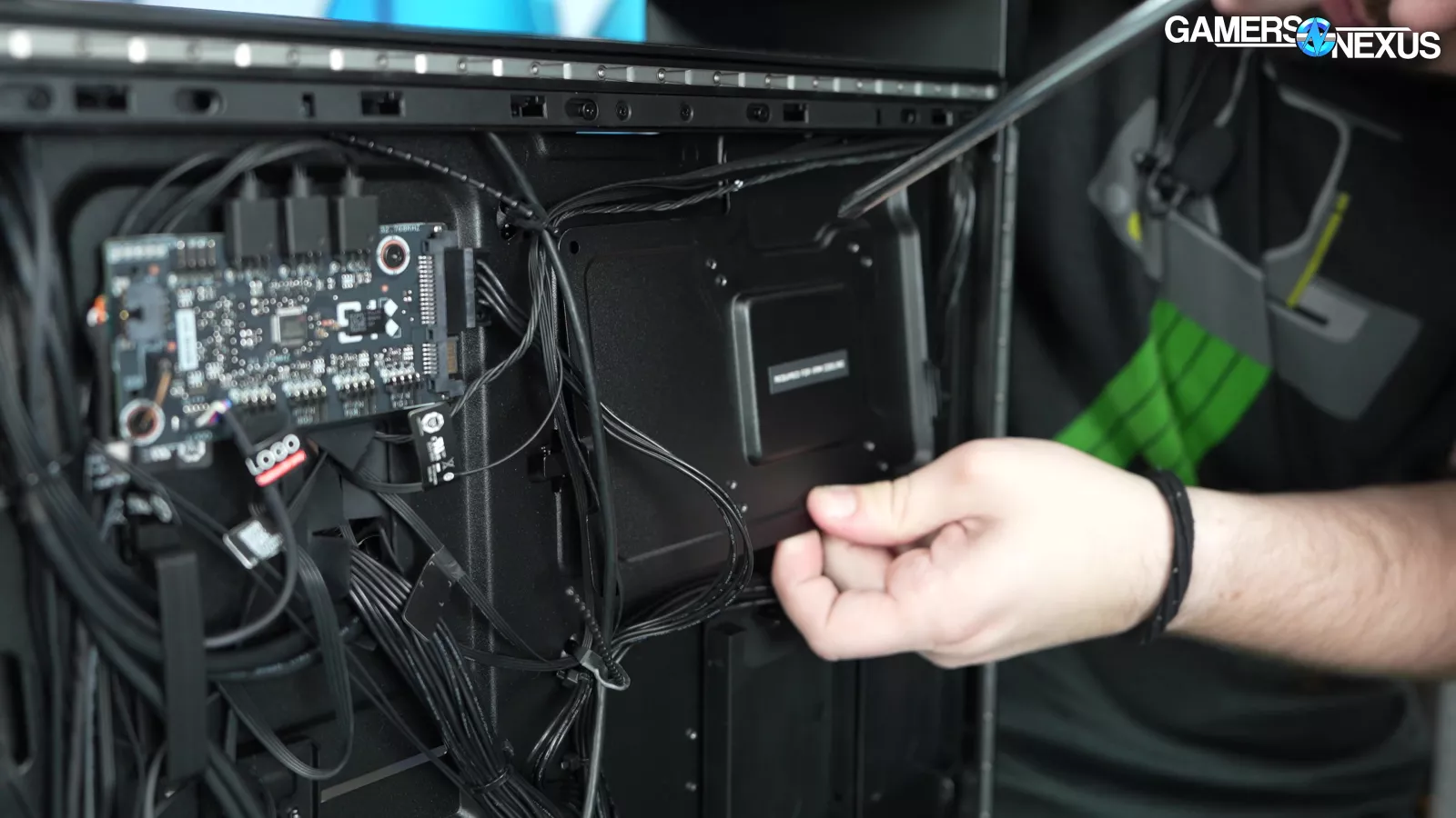 Taking a closer look at the backside, there’s 2x 2.5-inch SSD slots that are not pre-wired (some companies do that). In terms of cable management, it was done to what we would call the minimum degree. Really, it’s a mess, but it’s fully covered. This is where the smaller system integrators do a better job.