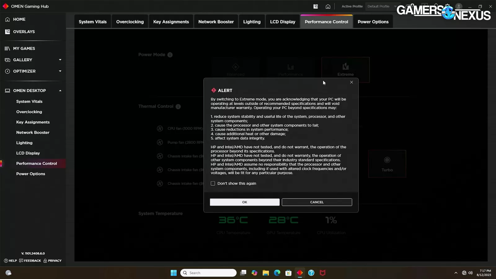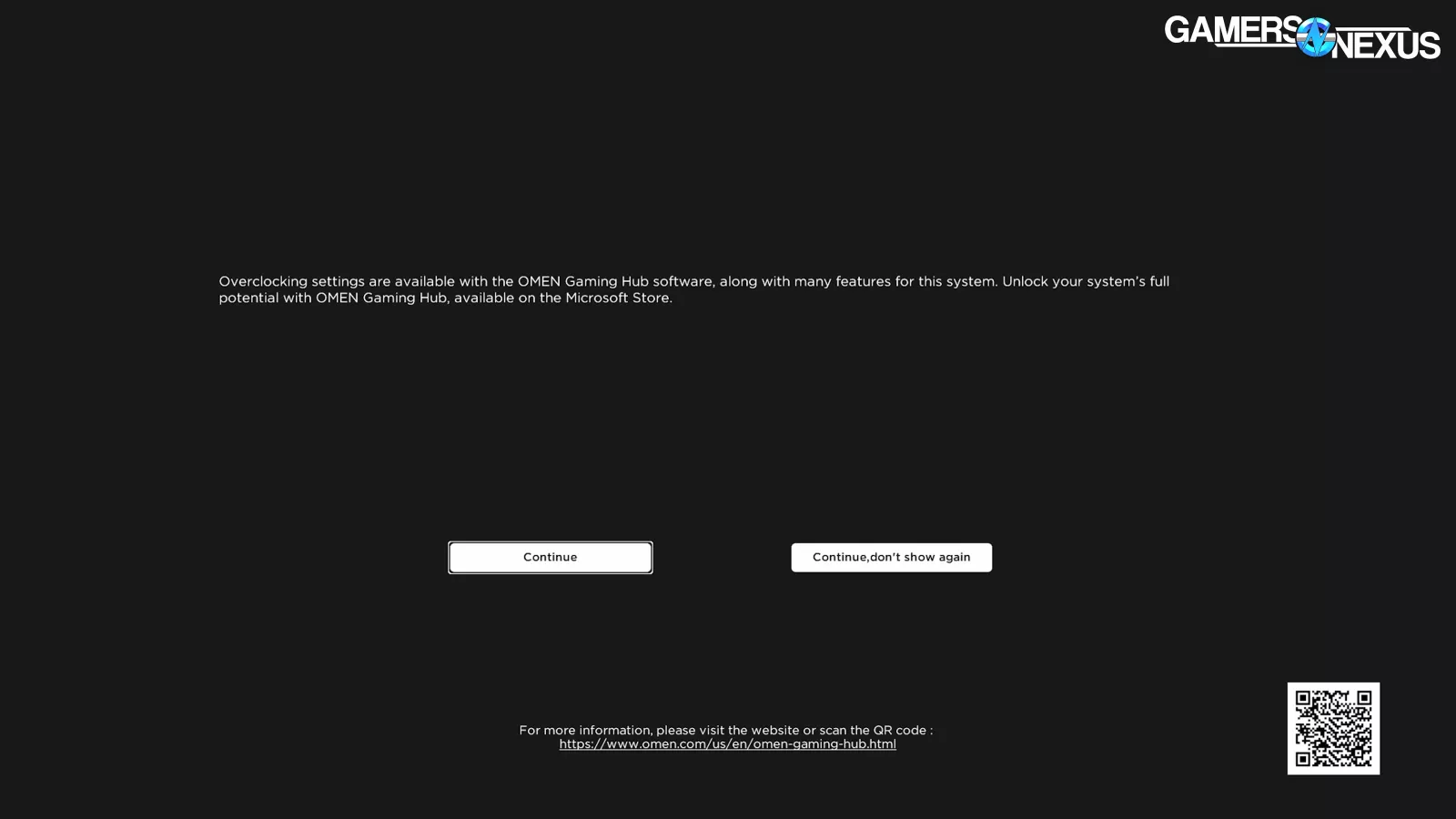 The BIOS itself is stripped-down compared to the full feature sets we’re used to on DIY boards, but enough settings are left exposed to make important tweaks if needed. Opening the Advanced page pops two full screen notifications – one strongly advertising the OMEN Gaming Hub software, and one with a warning about overclocking.