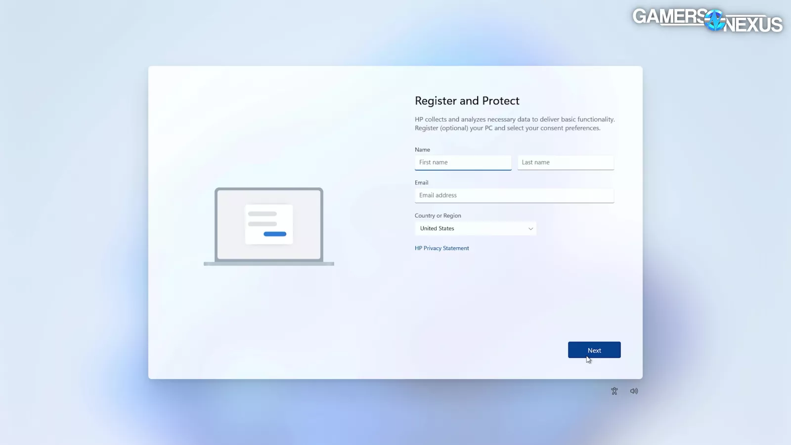 Windows 11 setup was the usual, with the added twist of trying to get us to register and give our data away to HP. Again. It’s possible to just click through these without entering anything, but the UI doesn’t make that plain – it’s a dirty trick that we’re sure works on tons of people.