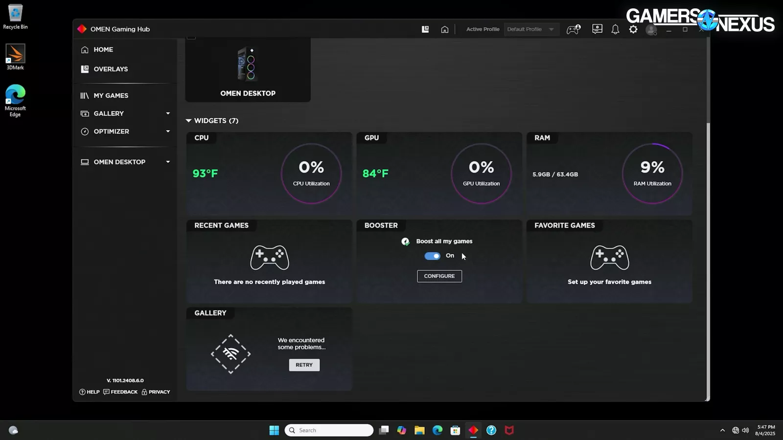 After finally getting the app open, we immediately realized that it’s trying to do too much. “Game Booster,” game launcher, hardware monitoring, overclocking, keybinds, “network booster,” lighting, fan control, and yet another overlay that we don’t want are all packed into this software that we imagine is maintained by a revolving door of contract devs.