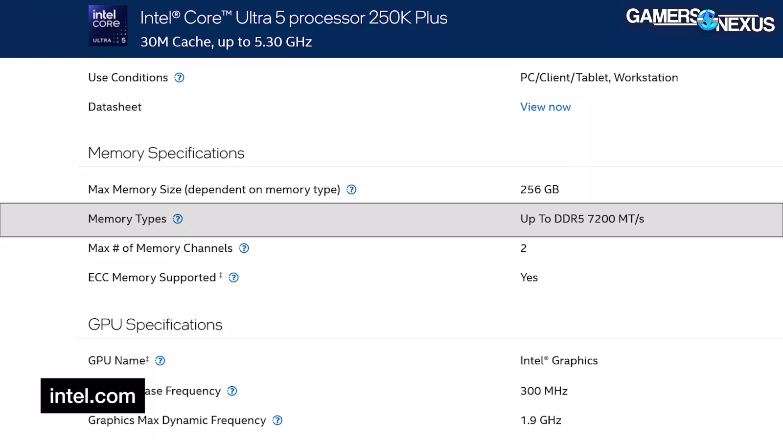 Intel’s new 250K Plus CPU is in the former i5 lineup and should be $190 to $200. The 250K Plus is running a 6 P-Core, 12 E-Core configuration for an 18C/18T spec at a 5.3 GHz max advertised boost. TDP is claimed at 159W for the 250K Plus, although TDP and actual power don’t match exactly. Intel is also now claiming native support for up to DDR5-7200 on the 250KP (up from 6400 previously), so... great, higher-end memory is supported.