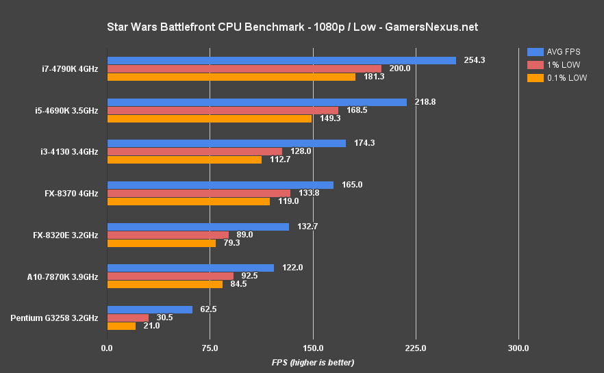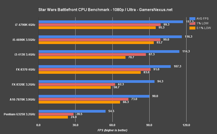 SW Battlefront CPU Benchmark – 1080p Low – G3258 vs. i3-4130, i5-4690K, FX-8320E