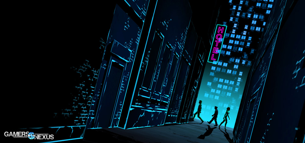 The Wolf Among Us presents itself as a cinematic experience with the grit and edginess of a dark comic book. Scenes often take on different colors, especially when Bigby is in the streets. Players walk through environments rich with neon blues and yellows and sulk in black shadows amid fuchsia light. Environments appear as 3D but feature some 2D or hand-drawn aesthetics, such as surfaces and lighting & shadows. Imagine walking around in a comic book -- that's the game's presentation in a nutshell.