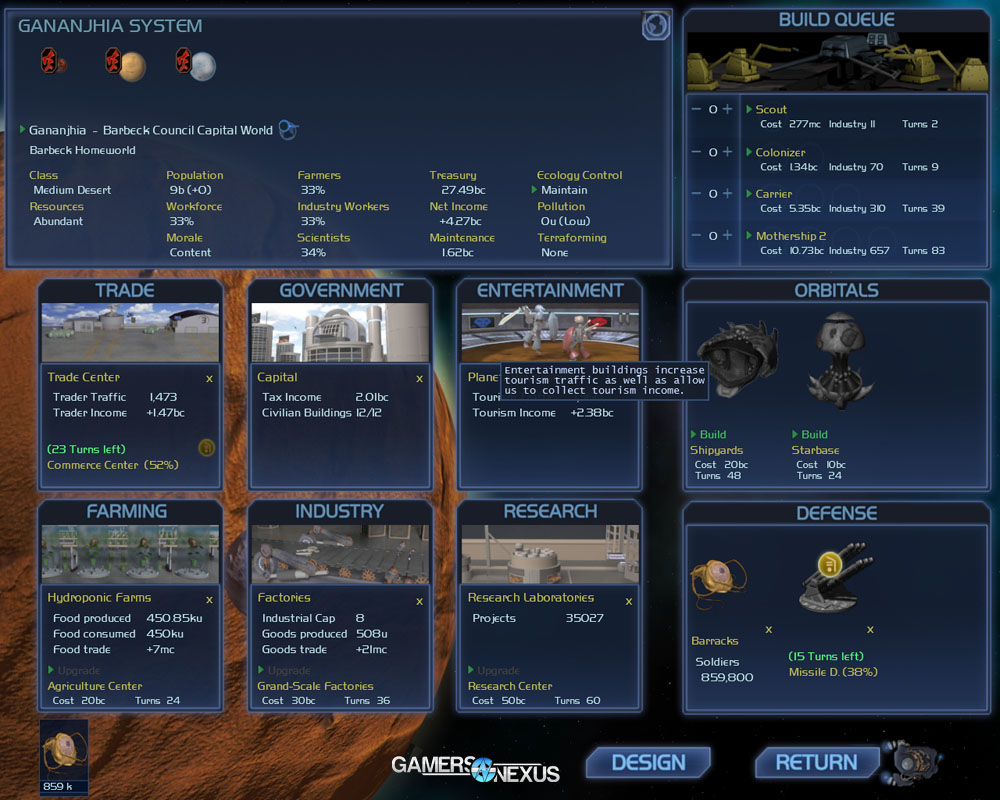 And then there are the technology trees -- a feature of the game that seems to have a massive impact on later gameplay. You can assign researchers to projects you find important, shortening their downtimes—much like in Civilization—with one exception: all of the techs are being researched at the same time, so races don't simply level-up sequentially. This allows the player to continue gaining useful information while allowing significant micromanagement on what the player needs accomplished sooner.