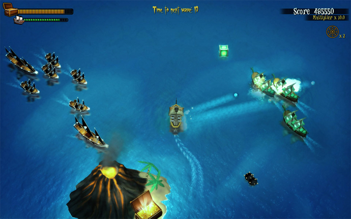 The gameplay is pretty simple. You move your ship with WASD and fire the cannons on the sides of your ship with the Left- and the Right Arrow keys. W and S alter the velocity of your ship, and holding down W for a while will get you to max speed, at which point you can let go of the button. The rate at which your ship's speed will increase / decrease is exceedingly high, making it difficult to navigate at a comfortable cruising pace. I kept having to juggle between as fast as I could go and almost not moving at all. Power-ups existed but were not worth much in the game; enemy ships drop one of three boxes, good boxes (green ones), bad boxes (red ones), and random boxes (brown ones). The random boxes merely gave you a good or bad power-up. The amusing names for the power-ups added more to the game than the powers they gave you, oddly enough. Does it matter if your cannonballs shoot through multiple enemy ships hitting all of the ships in a row? Not really, but you'll chuckle when you pick up the "balls of steel" power-up. Does freezing enemy ships with frost shots really add anything to the game play? Not a ton, but acquiring "blue balls" definitely does. There are also other power-ups that do not directly affect your ships cannons, such as "Homing Dolphins" and "Mines," but the increasingly powerful weapons do little other than water-down an already easy game. The negative power-ups were even less noticeable then the positive ones.