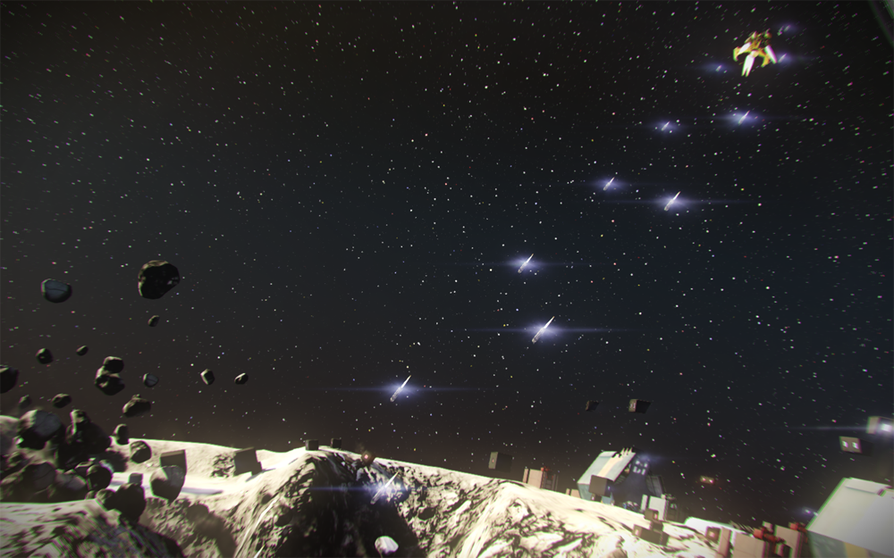 "Unlike many other games -- where their gameplay takes place on a fairly flat terrain, and sky ambient and the sun light direction is constant for a given time -- in Blackspace, the user can see both the daylight and the night side of the asteroid simultaneously. Compound that with the fact that the terrain is deformable over time in various ways, maintaining a pleasing look across the whole surface becomes fairly tricky. With any new lighting feature we add or change in the game, we double and triple check that it looks acceptable under all changing conditions."