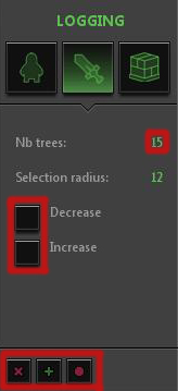 On Expansion: In the group UI block, you'll notice three icons -- one is defaulted, another is a sword icon, the final is inaccessible in the prototype. Selecting the sword icon gives options to delete, pause/play, and increase/decrease the zone's radius. Using the pause button will halt all action being taken by the group.