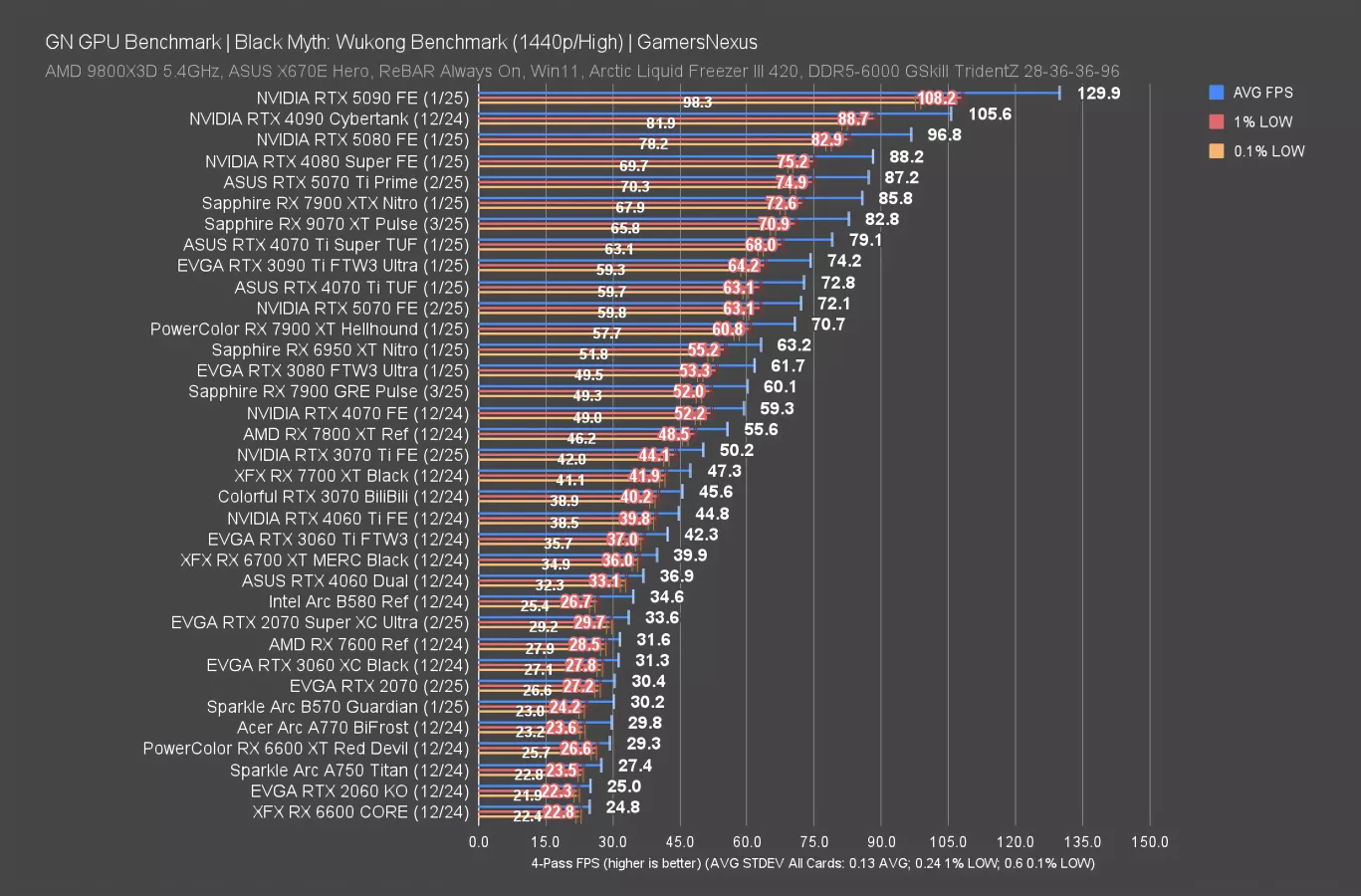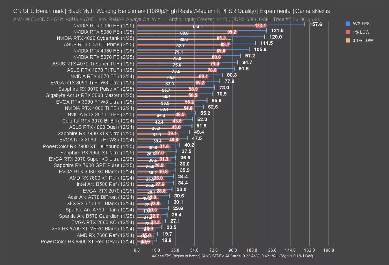 You can see NVIDIA getting embarrassed by its own choices again: The 4070 Ti (read our revisit) and 5070 are both crumbling in the 0.1% lows, which is a direct result of the low VRAM capacity. This low 0.1% value manifests as stuttery frame delivery and inconsistent frametime pacing.