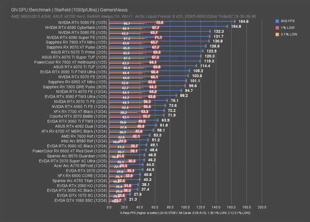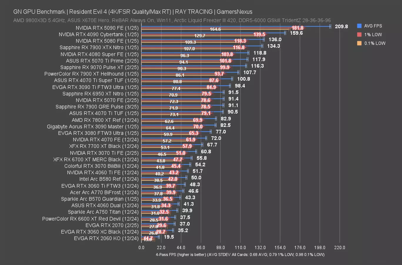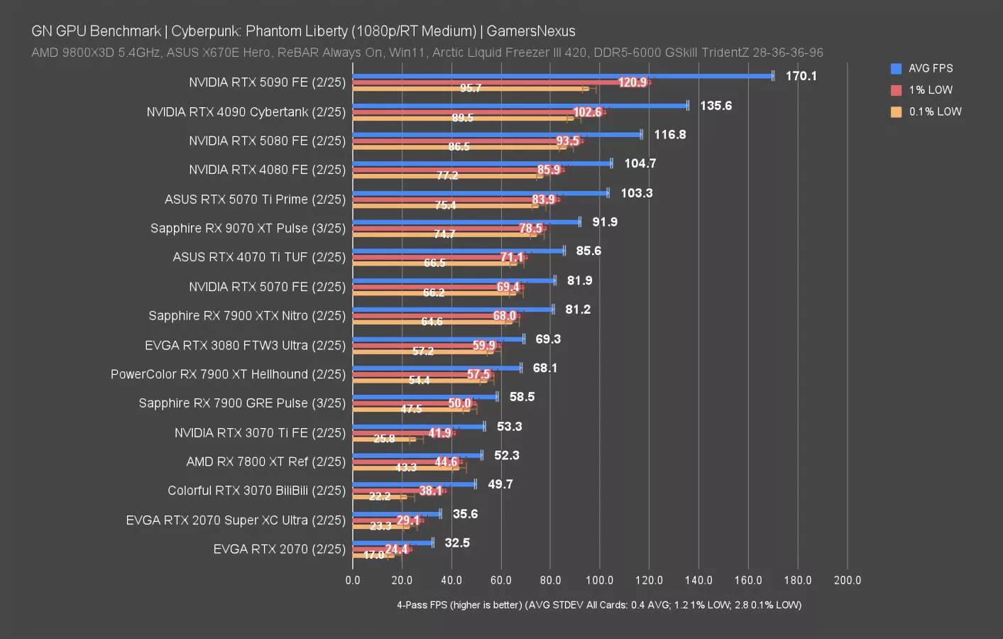 4K and RT Ultra tends to destroy cards with lower VRAM capacity, like the 5070 with its 0.1% lows. Cards like the 2070 (watch our review) and 2070 Super (watch our review) have been removed this time since they were unplayable and their results were just noise anyway. One could be better than the other just because neither can play the game.