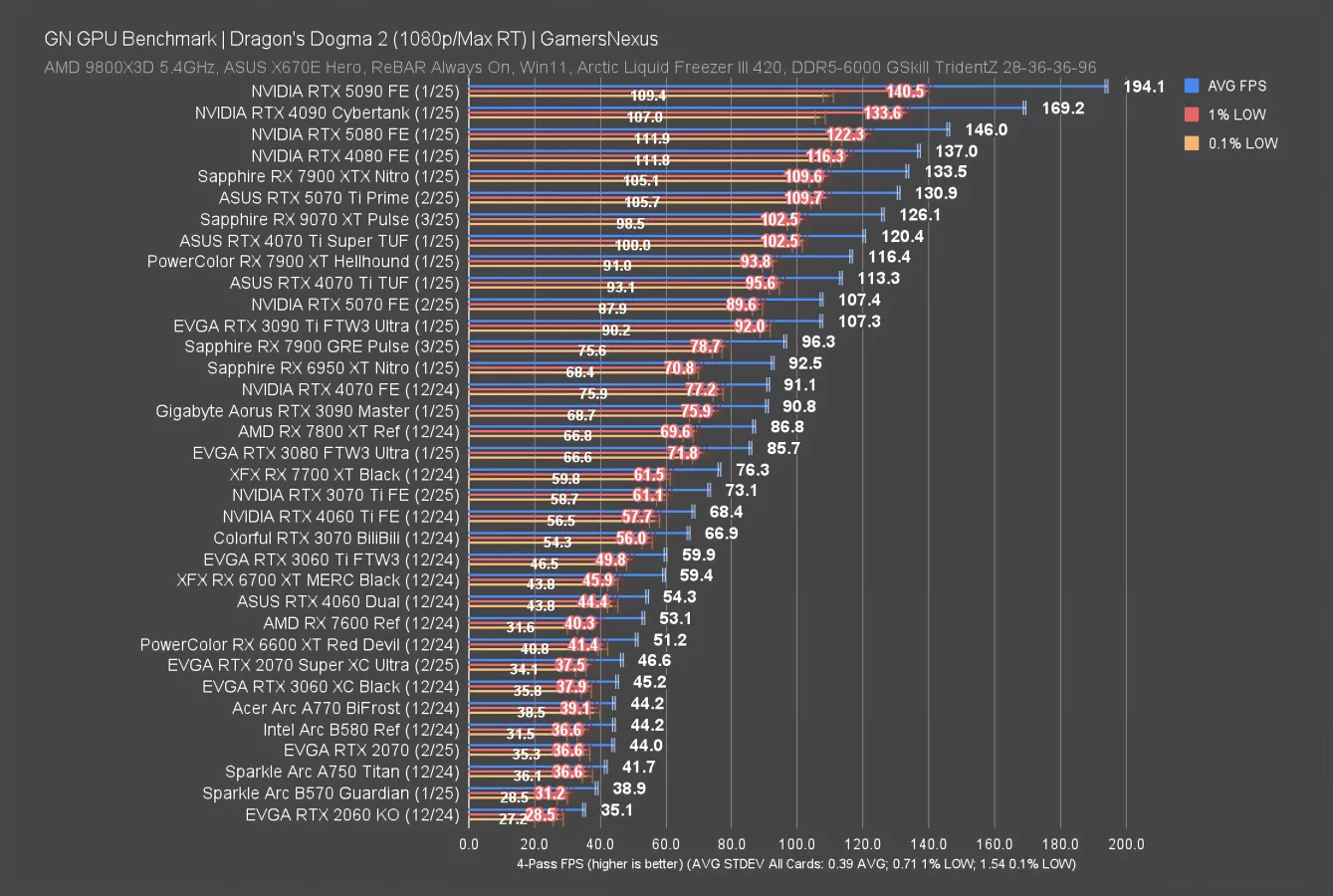 In Dragon’s Dogma 2 with ray tracing and at 4K, the RX 9070 XT ran at 61 FPS AVG. This has it ahead of the RTX 5070’s 49 FPS result by 26%. The 5070 Ti leads the 9070 XT marginally and by 2 FPS, or 3.6%. The 7900 XTX is about 5 FPS ahead of the 9070 XT.