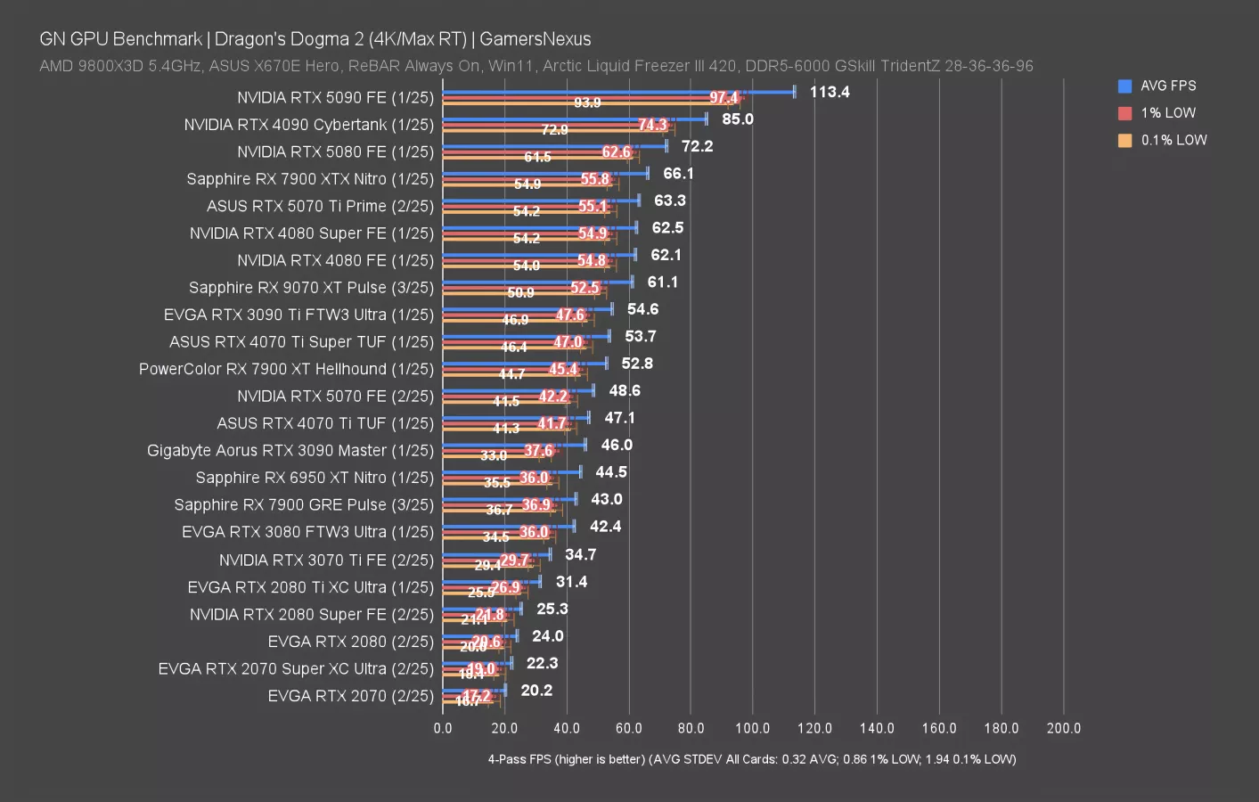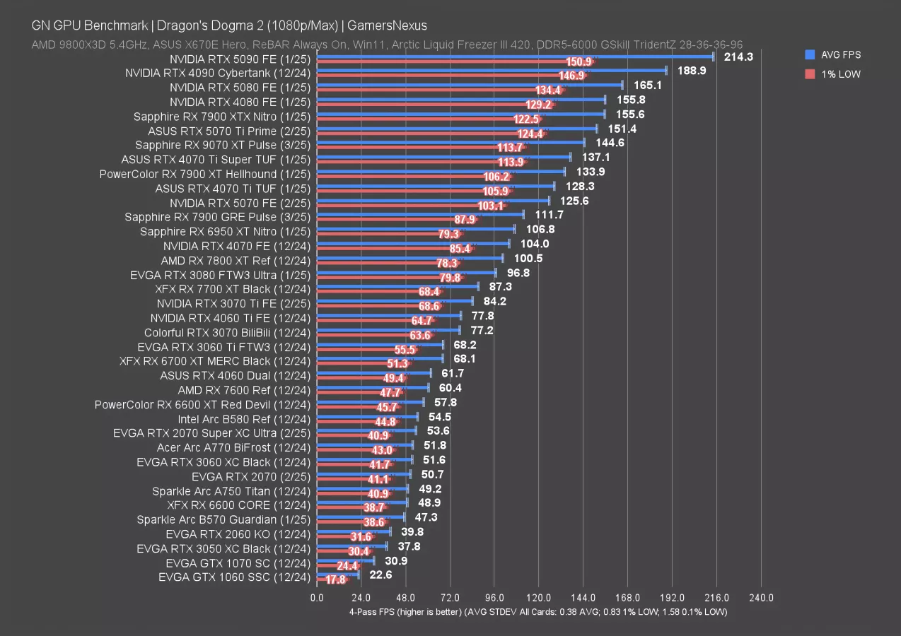 Dragon’s Dogma 2 at 4K is a remarkably strong showing for the RX 9070 XT. In this benchmark, the 9070 XT ran at 70 FPS AVG, landing it between the RTX 4080 (read our review) and RTX 3090 Ti. That means that even taking MSRP at face value for both cards, the $600 9070 XT is achieving 95% of the performance of the $750 RTX 5070 Ti Prime, but at 80% of its MSRP. We want to caution that this result doesn’t always happen -- sometimes a 9070 XT is worse than a 5070, so it depends on the game. But this is a great start.