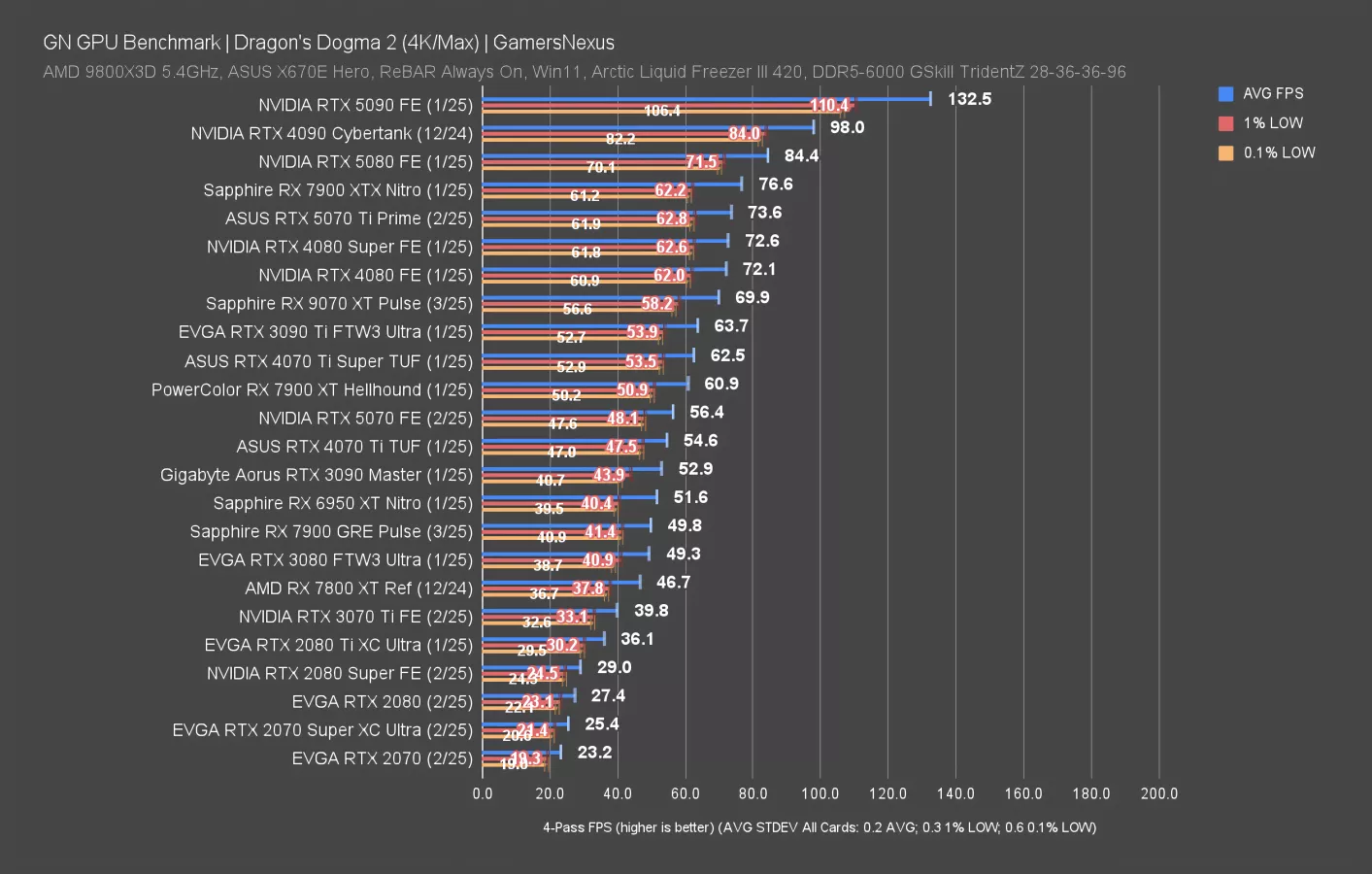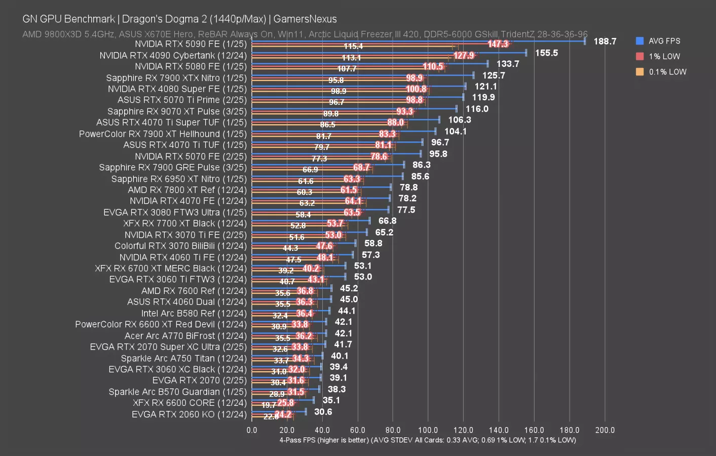 At 4K, the 9070 XT landed at 68 FPS AVG. Unfortunately for AMD, that means that the 9070 XT is worse than the RTX 5070 here. The 5070 leads the 9070 XT by 13.6% with its 78 FPS AVG; the 5070 Ti leads by a staggering 43%, at 97 FPS to 68. Whereas Dragon’s Dogma 2 was a strong position for AMD, it’s weak in this game. It all depends on the game itself.