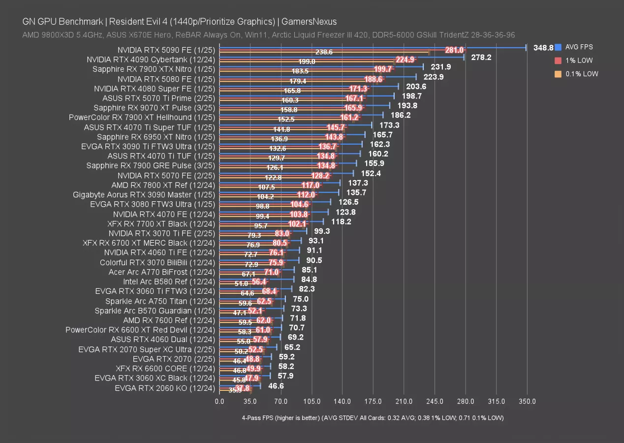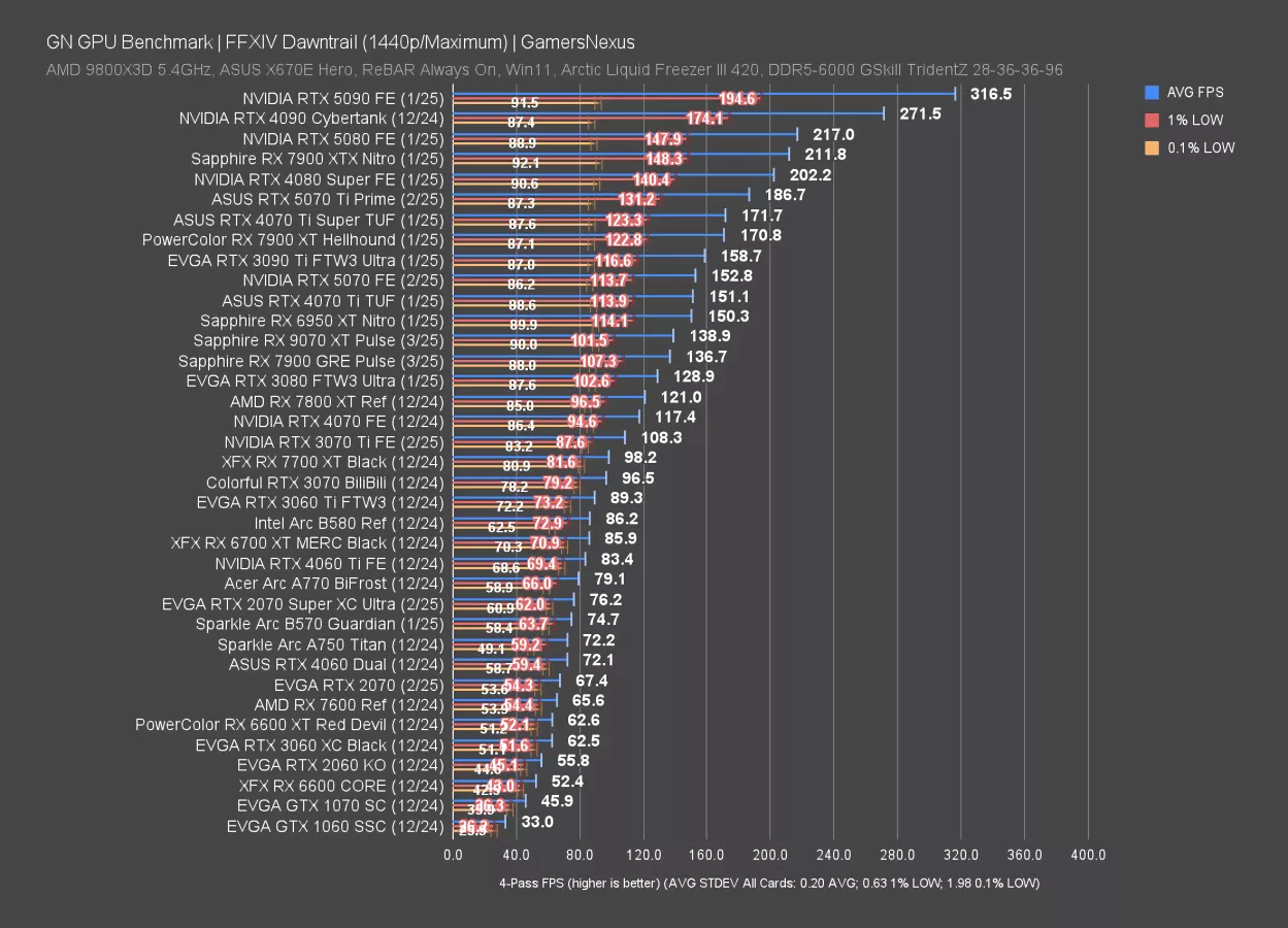 The RTX 4080 Super leads the 9070 XT by 5% here. The 7900 XTX was also once a $1,000 card and itself leads the 9070 XT by 20% with its 232 FPS result.