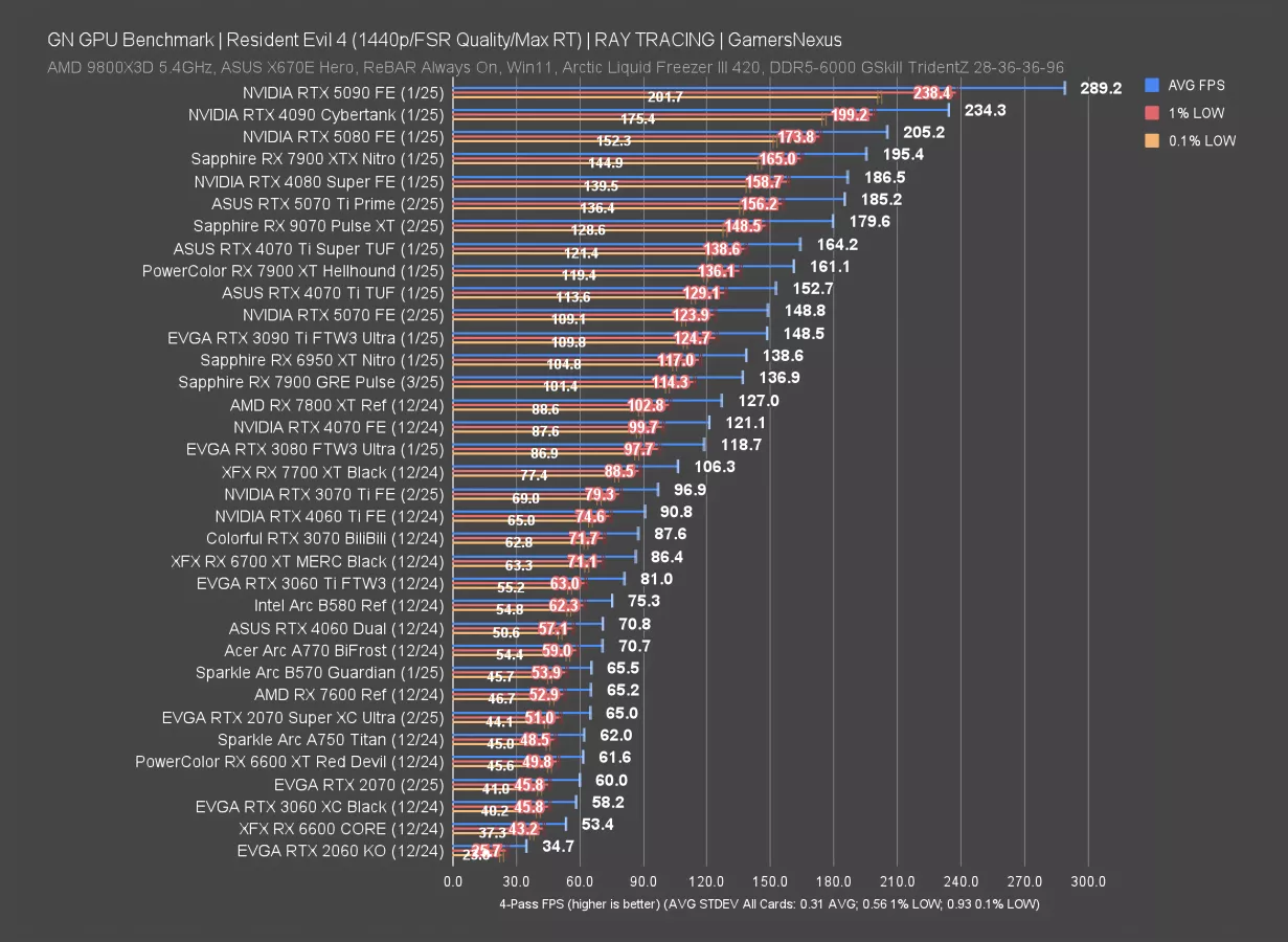 Resident Evil 4 is up now. At 4K with ray tracing and upscaling, the 9070 XT performs at parity with the 5070 Ti. This is another of the lighter-weight RT titles, so broadly speaking, thus far, games with fewer RT features implemented that lean more heavily on raster allow AMD to compete better.