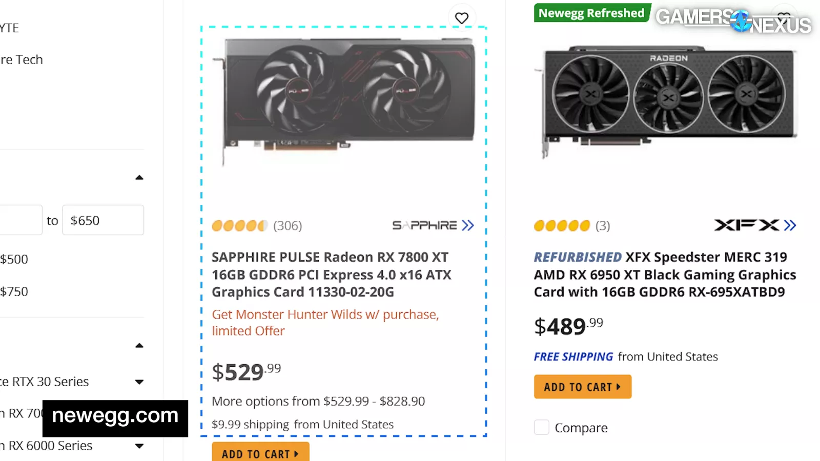 For our review of the card built entirely on lies and bullshit, the RTX 5070, we showed that Newegg only had a single GPU model in stock, sold by Newegg, that wasn’t refurbished when searching from $450 to $650. It was the 7800 XT.