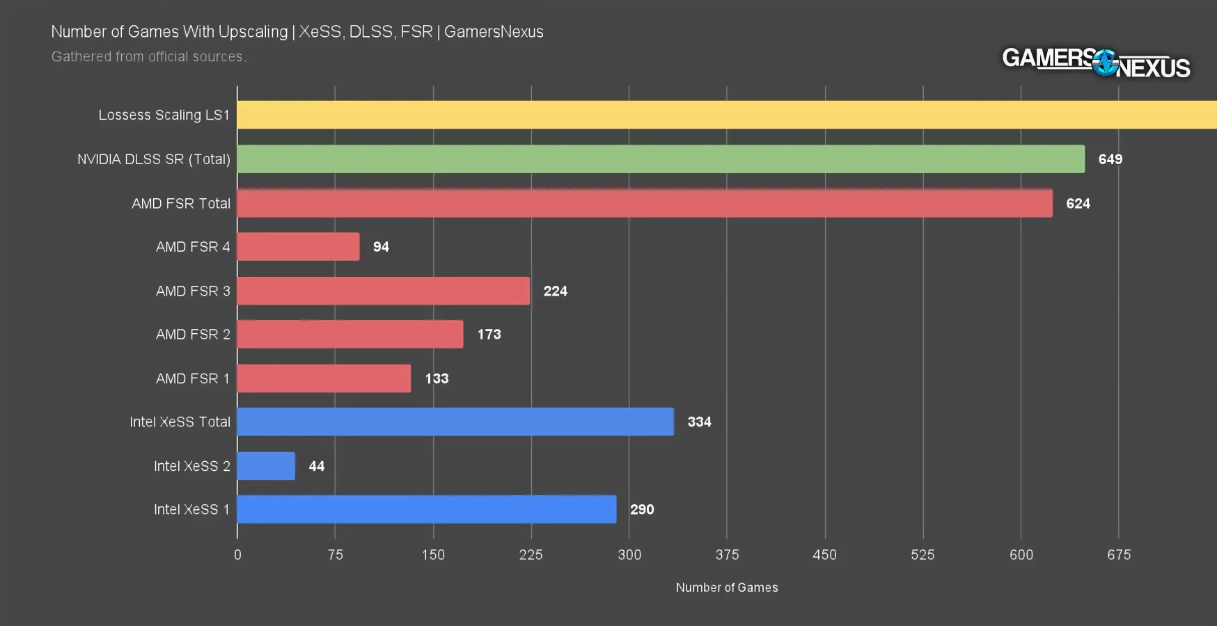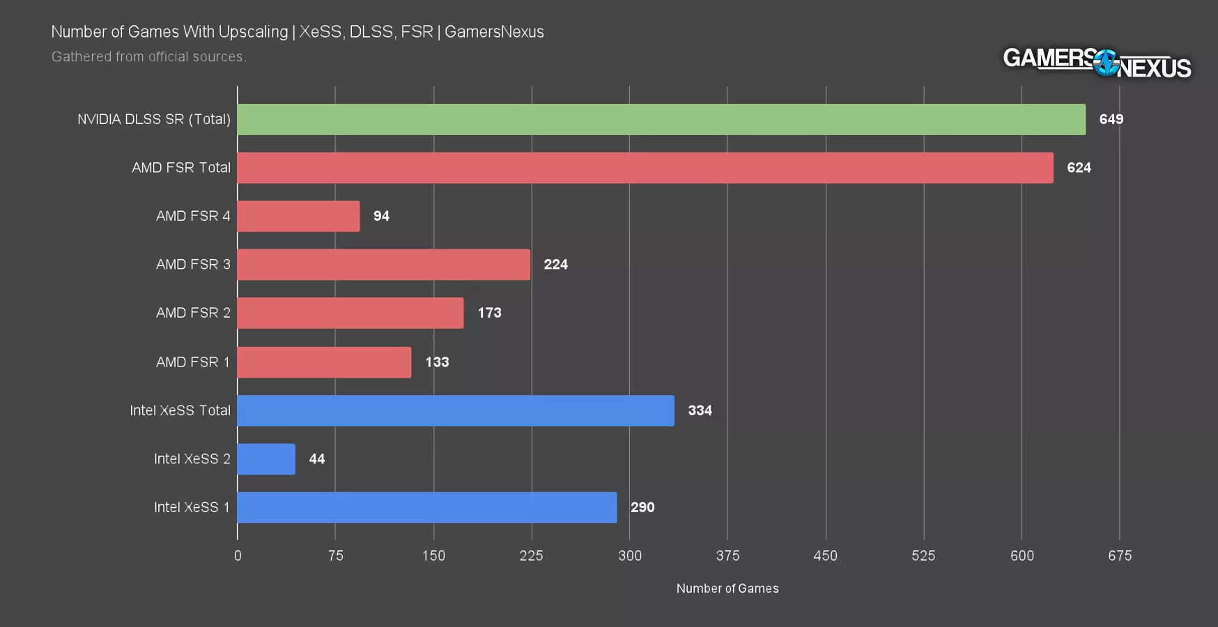 AMD nearly doubles Intel’s XeSS count at 624 games supporting some form of FSR. FSR 1 is significantly lower quality than the versions that succeeded it due in major part to being strictly spatial and not temporal, but we’re counting it here.