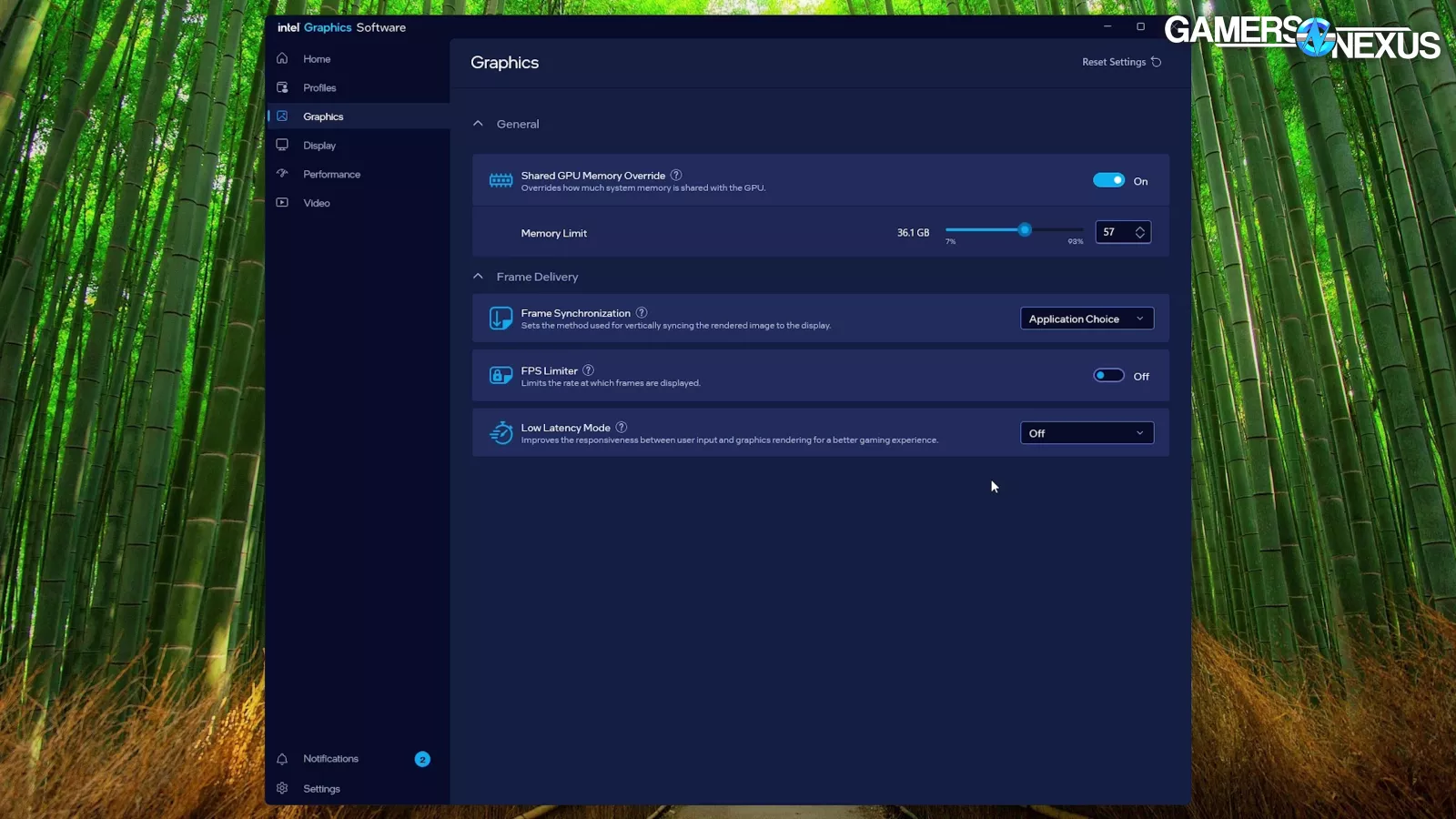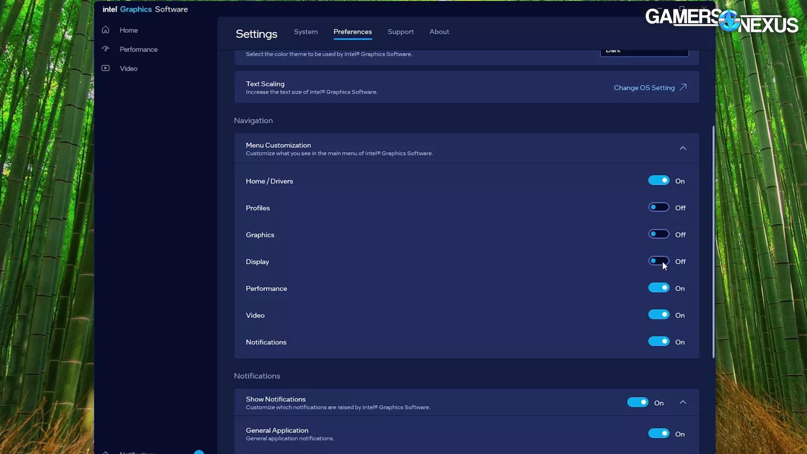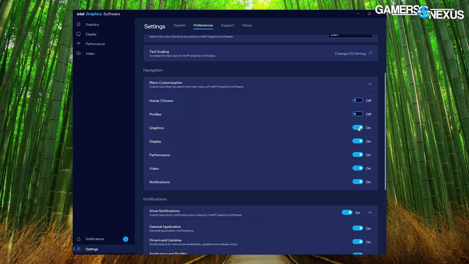 As for the current state of Intel’s software, it’s broken down into multiple tabs: Home, Profiles, Graphics, Display, Performance, Video, Notifications, and Settings. We went through all of them, adjusting values, flipping toggles, and generally poking it to see if we could get anything to fall out in a general shake test.