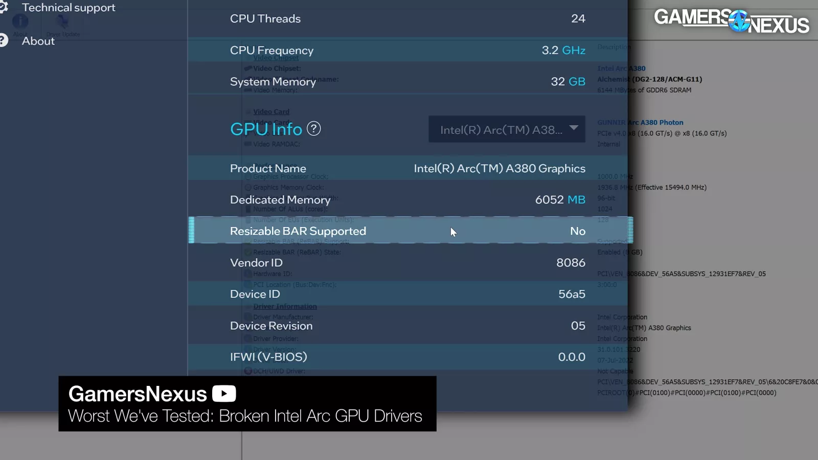 This one wasn’t an issue. It was a design choice: Arc needs ReBAR. It works without ReBAR enabled, but performance can be massively worse depending on the application. This issue is inherent to the memory controller used by Intel. Intel's memory controller doesn't perform well with small transactions; it prefers the large transactions enabled by ReBAR. Again, this is an area where we think Intel compromised well by focusing on newer platforms, which usually support ReBAR and enable it by default. It may hurt Arc's ability to fit in the ultra-budget space, though, since old hardware is less likely to support ReBAR.