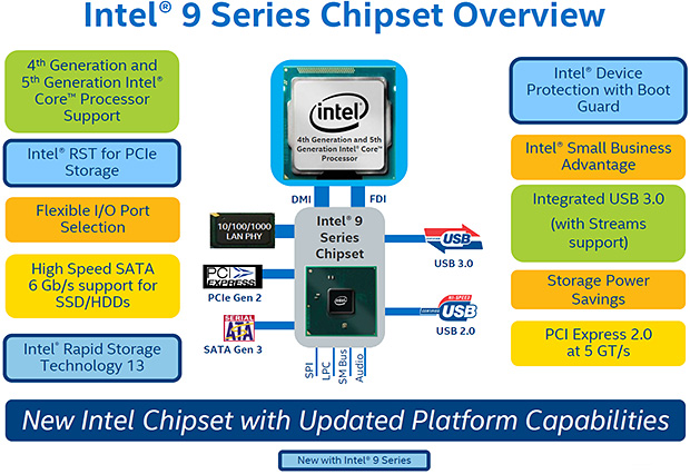 The Desktop Management Interface (DMI) that bridges communications between the CPU and chipset has been updated to version 3.0, entering territory of PCI-e 3.x transfer rates. This shift has increased the data sample rate from 5GT/s (gigatransfers, of which 1GT = roughly one billion transfers per second) to 8GT/s. The increase results in nearly a 2x sample rate jaunt, the equivalent of moving from 2GB/s to 3.93GB/s.